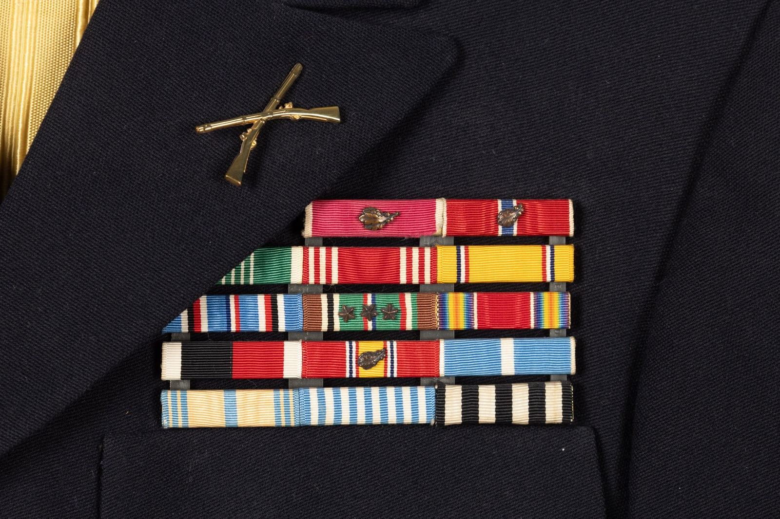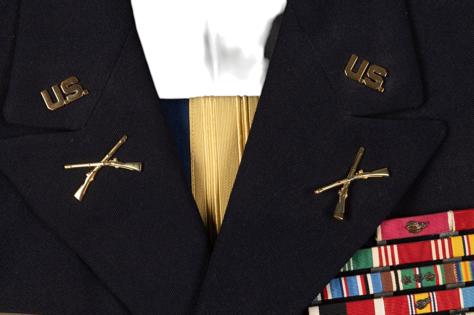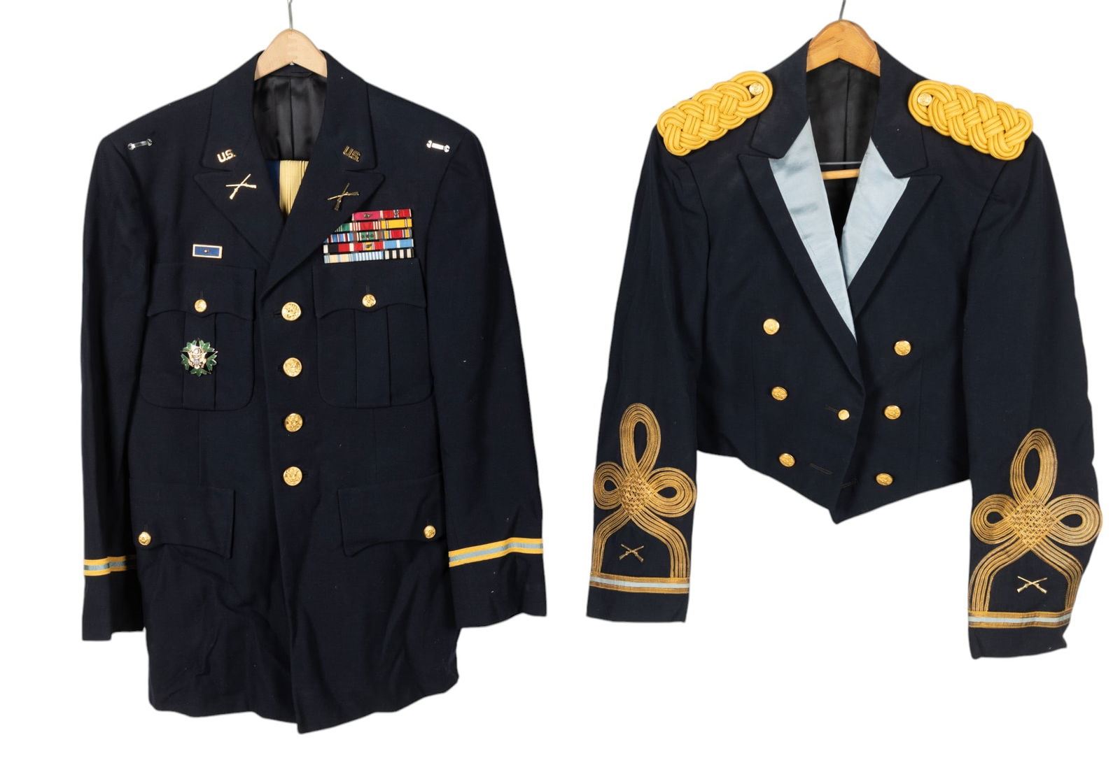 Army Rifleman officers dress uniform made by Lautersteins San Antonio with DOD Staff officer brooch, 17" shoulder and 30" waist for the pants and Riflemans mess dress uniform jacket, 17" shoulder.