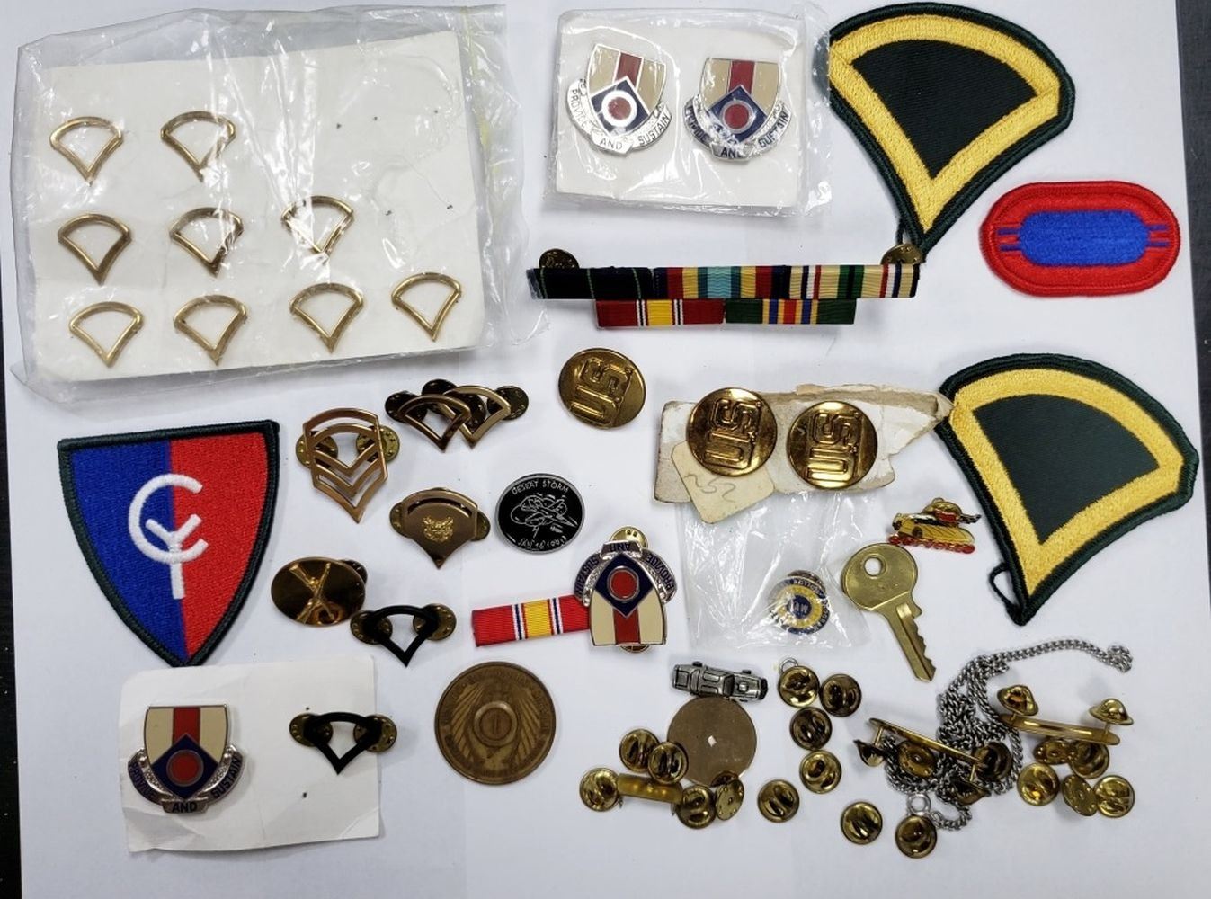 Rank patches & Pins, Shoulder Patches, SF(?) Oval Flash, Ribbon bar, and other various pins. Some may not be military related.