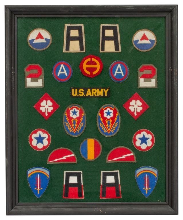 Item/Description: Framed and mounted collection of WWII US Army patches. 23 insignia include: