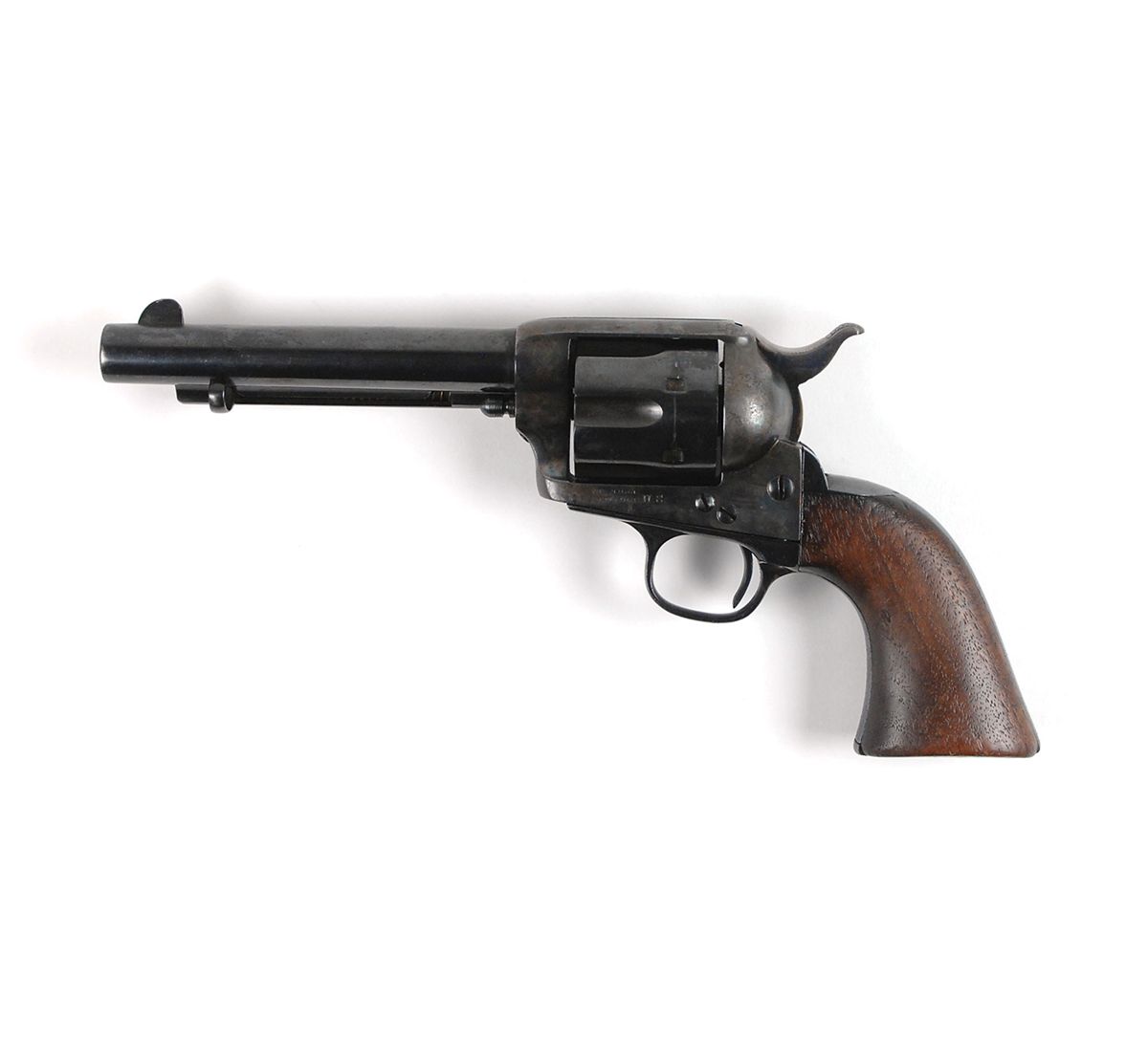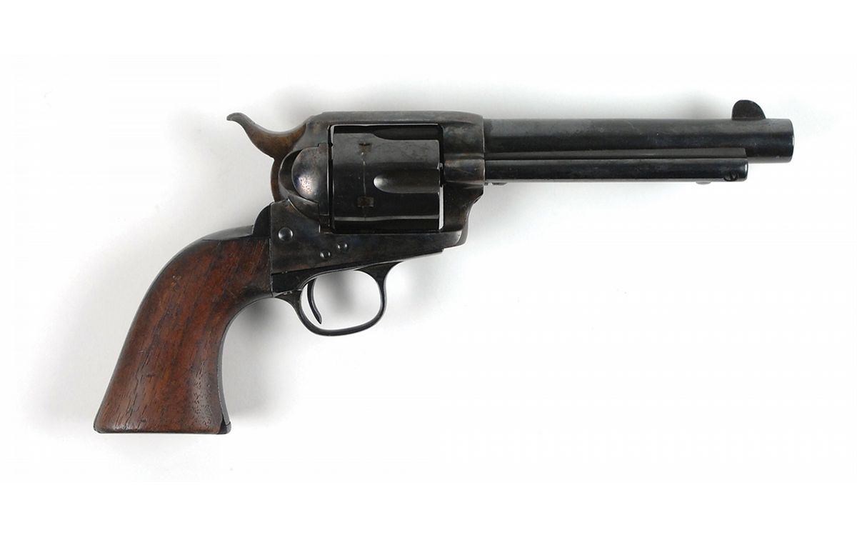 #8111, cal. .45 Colt, the 5.5? barrel has a good bore with minor corrosion. This revolver was built in 1874 for the US Cavalry and rebuilt for the US Army circa 1900. As is common on these the parts do not have matching numbers. The barrel has no number but does have the “R. A. C.” military inspector’s stamp applied to these rebuilt revolvers with new replacement barrels. The trigger guard has no number but does have a single “K” military inspector’s stamp. The backstrap is numbered 37135 with no inspector’s stamp visible, the one-piece walnut grip is stamped “R. A. C.” on the butt. The cylinder has no visible number and is marked “R. A. C.” on the rear. The barrel address, patent markings and “U. S.” on the frame are in excellent condition. The metal retains over 85% finish with strong case colors on the frame and hammer. The grip is in fine condition with two small chips at the toe on the right side. The half-cock notch on the hammer is worn, otherwise the mechanism functions well and the cylinder locks up tightly.