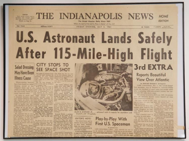 We present you with a framed front page newspaper headline from The Indianapolis News, "US Astronaut Lands Safely After 115 Mile High Flight," published onMay 5, 1961. This clipping is mounted in a 12" x 16" black frame and comes from an estate collection. This shocking headline will be remembered in US space history for generations to come.