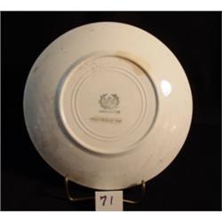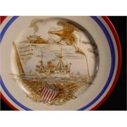 8 1/2" Souvenir plate of US battleship Maine, destroyed in Havana harbor Feb 15th 1898, decal with hand coloring, red and blue band around scalloped edge. Marked EBP Co., shield inside a wreath, patent applied for. Has some stains on back.