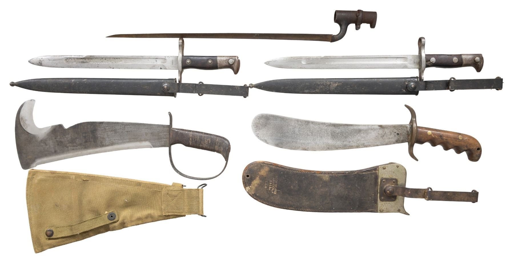 This edged weapons lot includes1 Krag bayonet dated 1899 and scabbard. / 1 Krag bayonet dated 1900 and scabbard. / 1 WWII era us "Woodman's Pal" survival knife/machette with scabbard. / 1 US M1904 Hospital Corps knife dated 1913 with scabbard. /1 British Martini Henry triangular socket bayonet without scabbard. CONDITION: Krag bayonets show little wear. other items show light wear. (02-24155/BF). NON-GUN. $600-800.