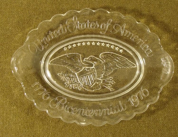 US BICENTENNIAL 1776-1976 GLASS PLATTER-13 STARS OVER EAGLE & SHIELD-SCALLOPED EDGEEXCELLENT CONDITION-RELIEF ARTWORK ONBOTTOM100954