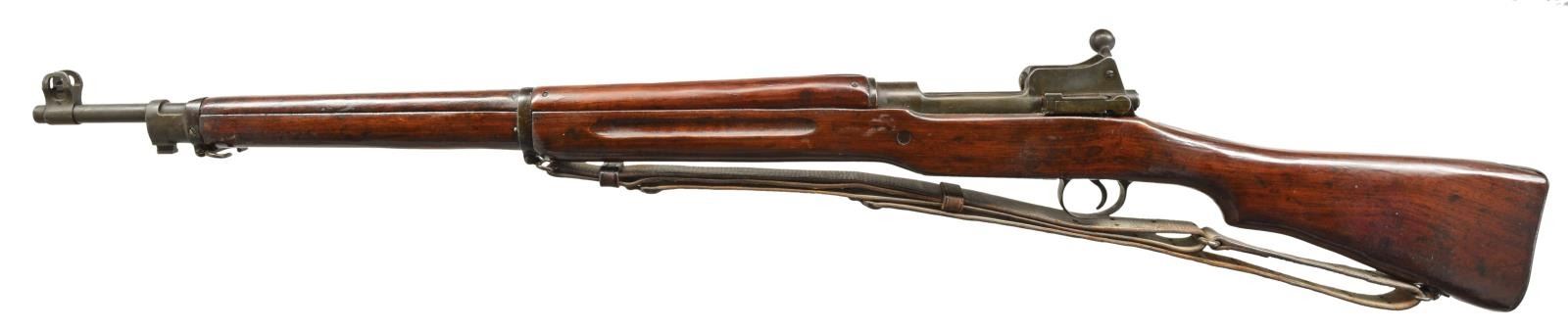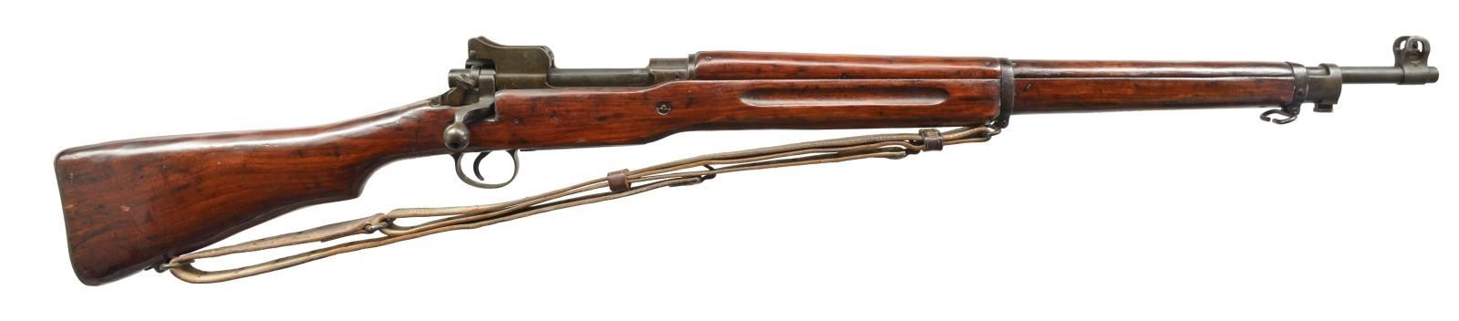 Cal. 30-06. S# 1040501. Bbl. 26". Ladder aperture rear sight graduated to 1500yds. Blade front sight w/ protective ears. Bbl. marked “E”, flaming bomb, “9-18”. Bolt is marked “W” & “NS” for Nickel Steel. Bolt has flaming bomb. Cocking piece marked “W”. Safety is marked “E”. Walnut stock set has obscured markings due to added finish. 19-07 Style leather sling marked “Boyt” & “43”. CONDITION: stock set has added finish w/ over wear, dents, staining & scratches. Finish has notable runs. Metal has traces of blue turning gray & patina w/ wear & handling marks. Bore has lightly worn lands, turning dark in grooves. (20-1449/RW). CURIO. $300-500.
