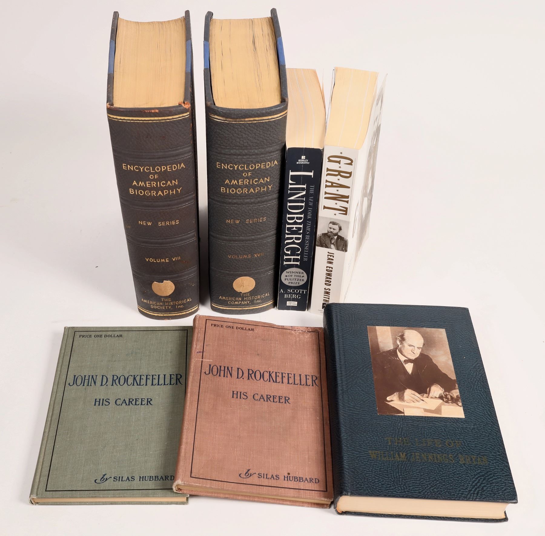 Encyclopedia of American Biography Vols. 8 and 17. Lindbergh by Berg. The Life of William Jennings Bryan by Herrick 1925. 2 different color covers(1 damaged)-John D, Rockefeller, His Career by Hubbard. Grant by Smith.