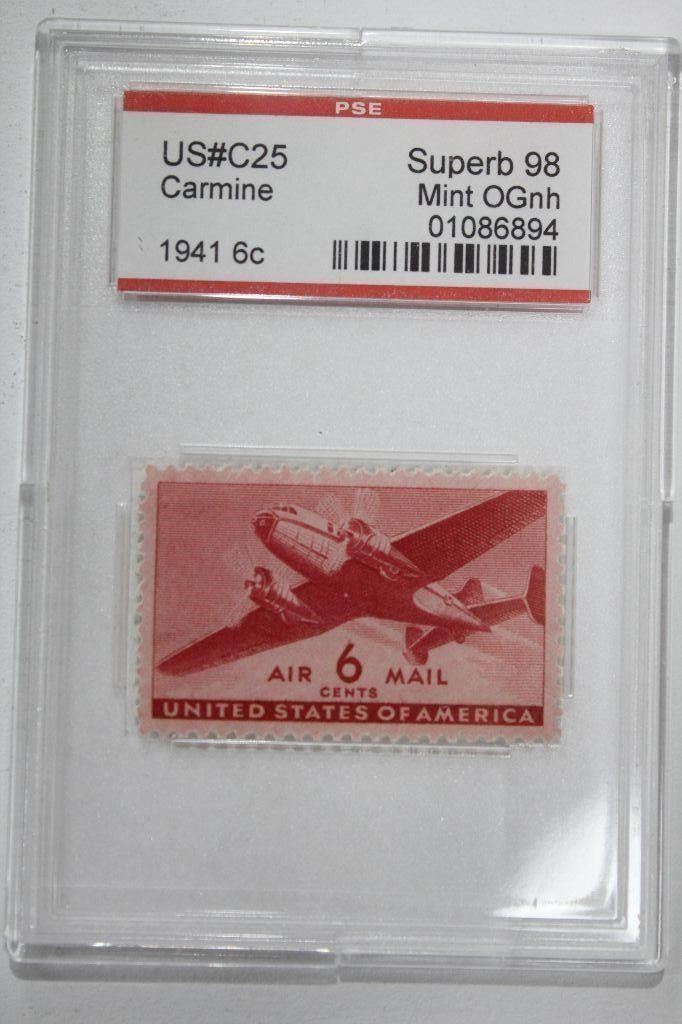 A US #C25 Airmail 6 Cent Carmine MINT OGNH XF PSE Graded Gem 98. A registry quality stamp with only 10 graded higher. About as nice as this issue comes.Slabbed, SMQ is $175.00