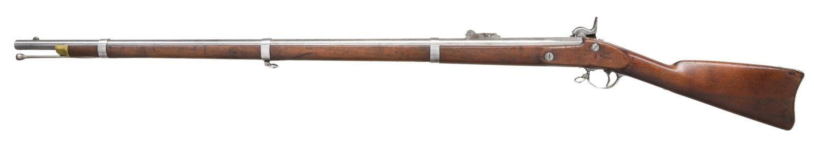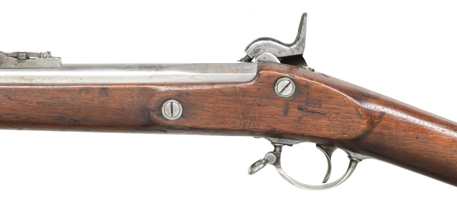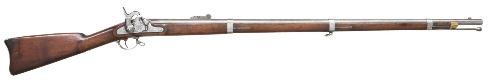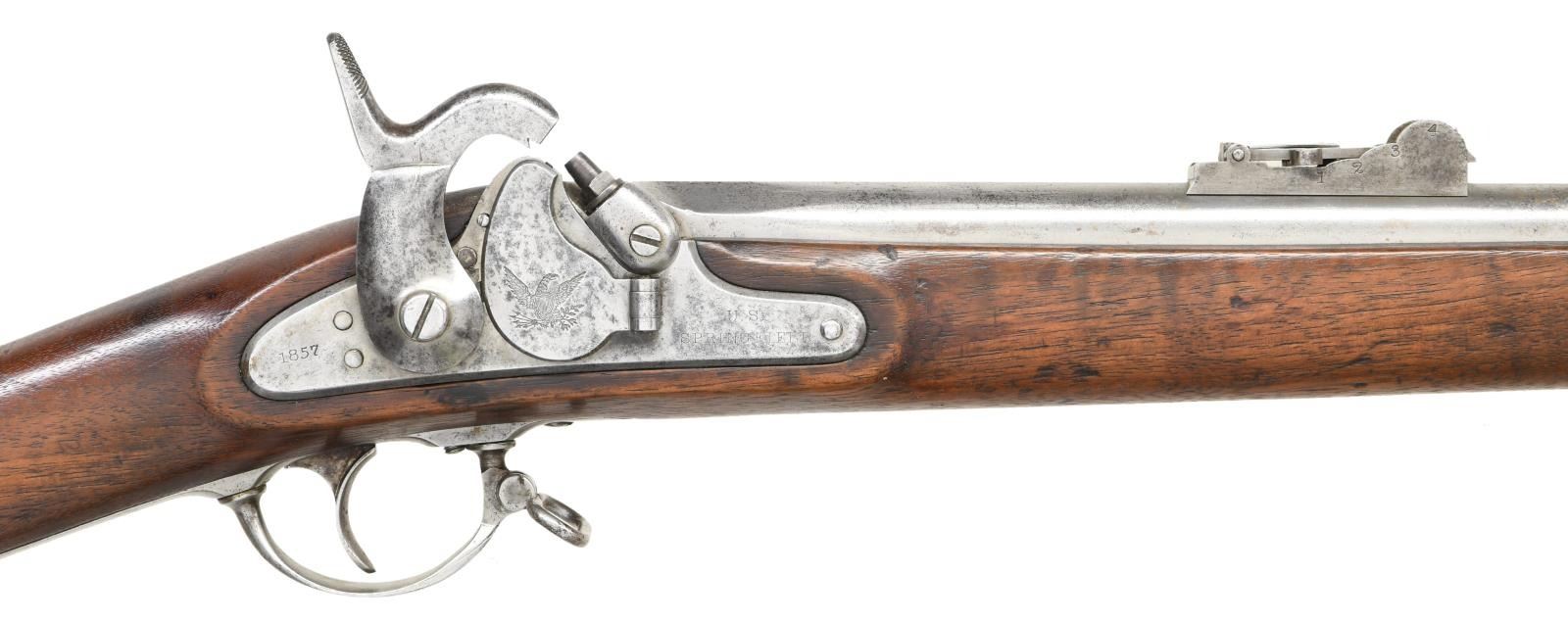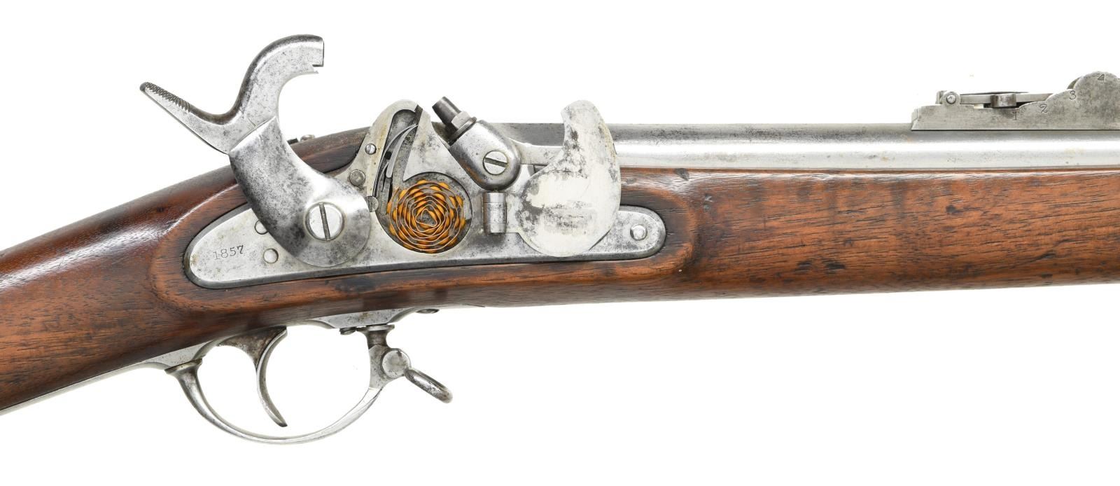 Cal. 58. NSN. Bbl. 40", marked on top left flat w/ "VP" eagle head proof & marked on top "1857". Ladder rear sight graduated to 800 yards. Ladder marked "U.S.". Stud type front sight. These arms were mfg. w/ the short lived Maynard tape primer mechanism. Lock which is equipped w/ a fully functional tape primer contains a partial roll of the primers which resemble the paper caps used in toy guns. The primer door which is hinged on the lockplate is marked w/ the spread winged eagle. The front of the lockplate has "U.S. SPRINGFIELD" and the tail of the plate is dated "1857". Walnut stock is marked on the left panel with 2 illegible inspectors' cartouches. Buttplate marked "U.S." on the tang. Forend equipped w/ 3 solid flat bands retained by springs. Correct brass forend tip. Correct tulip headed ramrod w/ "swell". CONDITION: stock has vintage restorative finish w/ softening of edges & has wear, staining & scattered handling marks throughout while retaining a good appearance. Metal has been cleaned, has wear & peppery oxidation & is returning to a slightly gray appearance. Bore has strong lands & a degree of shine w/ scattered pitting throughout. (01-23836/RW). ANTIQUE. $900-1,200.
