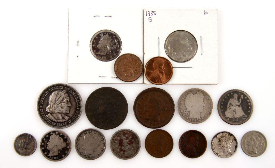 A variety coin collection large cents to Barber type, better dates and some high grades as follows, 1834 and 1848 large cents VG, 1859 Indian AU or better, 1873 Indian G, 1909 VDB UNC Lincoln small cent, 1909 VDB circulated type coin, 1872 CN 3 cent piece VF, 1851 O circulated silver half dime, 1882 shield nickel type, 1883 with cents V nickel and a 83 no cents type condition, 1889 V nickel poor type better date, 1935 S buffalo in XF, 1926 D Mercury dime VF, 1854 arrows seated quarter G, 1897 S Barber key date in AG, and lastly a silver Colombian Expo Commem in F.