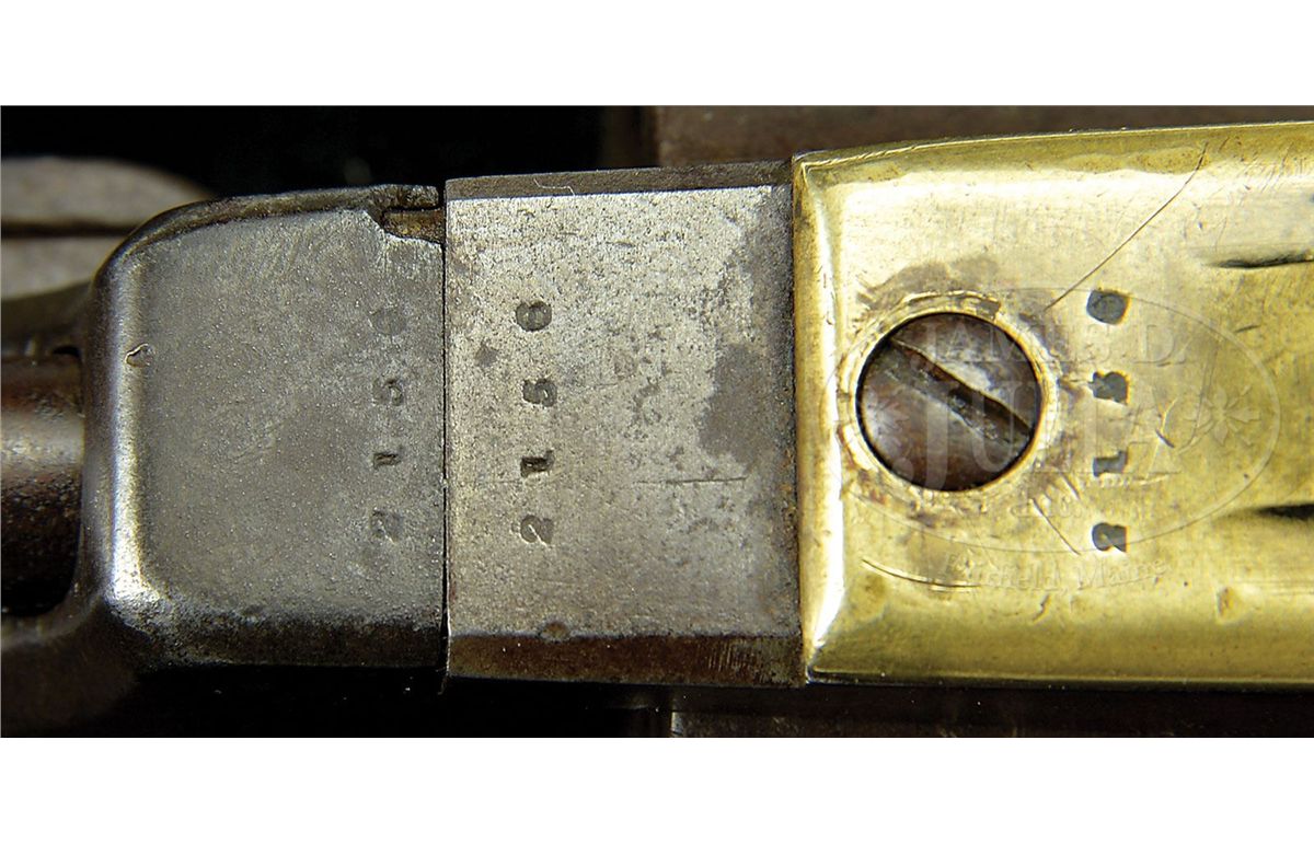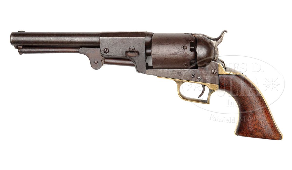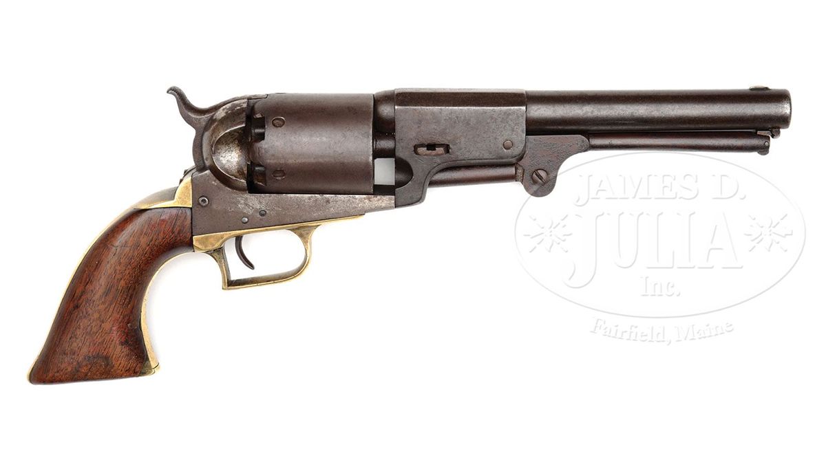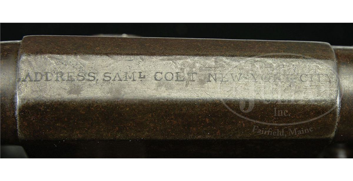 SN 2156. Cal. 44. This is a very nice "as found" example of the rare Walker replacement Dragoon once known as the "FLUCK". This gun was recently discovered in a northern estate. These guns were made to replace Walker revolvers that had left service. Of the few hundred replacement Walker Dragoons most saw very hard service and finding an orig example with no restoration like this example is difficult. This gun conforms to other examples with 7-3/8" part round/part oct bbl. Small inspector "P" are found on many parts including frame, cyl, backstrap, hammer, loading arm, and trigger guard. Gun appears all orig and authentic showing honest hard use and no abuse. The distinctive Walker style "slim-jim" grips have good color matching the overall look of this scarce martial Colt. CONDITION: Gun is brown/gray overall with tiny traces of muted case color in protected areas. Bbl and cyl have scattered areas of staining and pitting. Cyl has "ghosts" of rolled scene visible. Mechanically gun is sound and functional with good markings though a few letters and address are weak as can be seen in photographs. Stocks are sound and solid with a chip on right toe of right grip. 4-49299 JS203