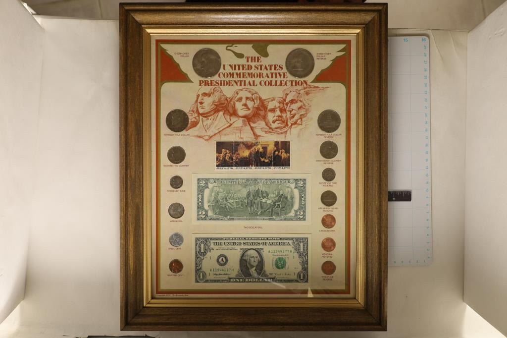 STAMP SET IN A NICE FRAME. INCLUDES BLOCK OF 4 US 13 CENT STAMPS, 1995 US $1 FRN (CU), A US $2 FRN (CU), 2-IKE DOLLARS 1-1971 & OTHER ?, 2-KENNEDY HALF DOLLARS 1-1995 AND THE OTHER ?, 2-WASHINGTON QUARTERS 1976 & 1992,