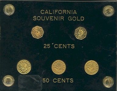 US California Gold Souvenir Set. Comes in Capital holder and includes 2 x 1853 25¢, 1852 50¢(2) & 1854 50¢. Replicas.