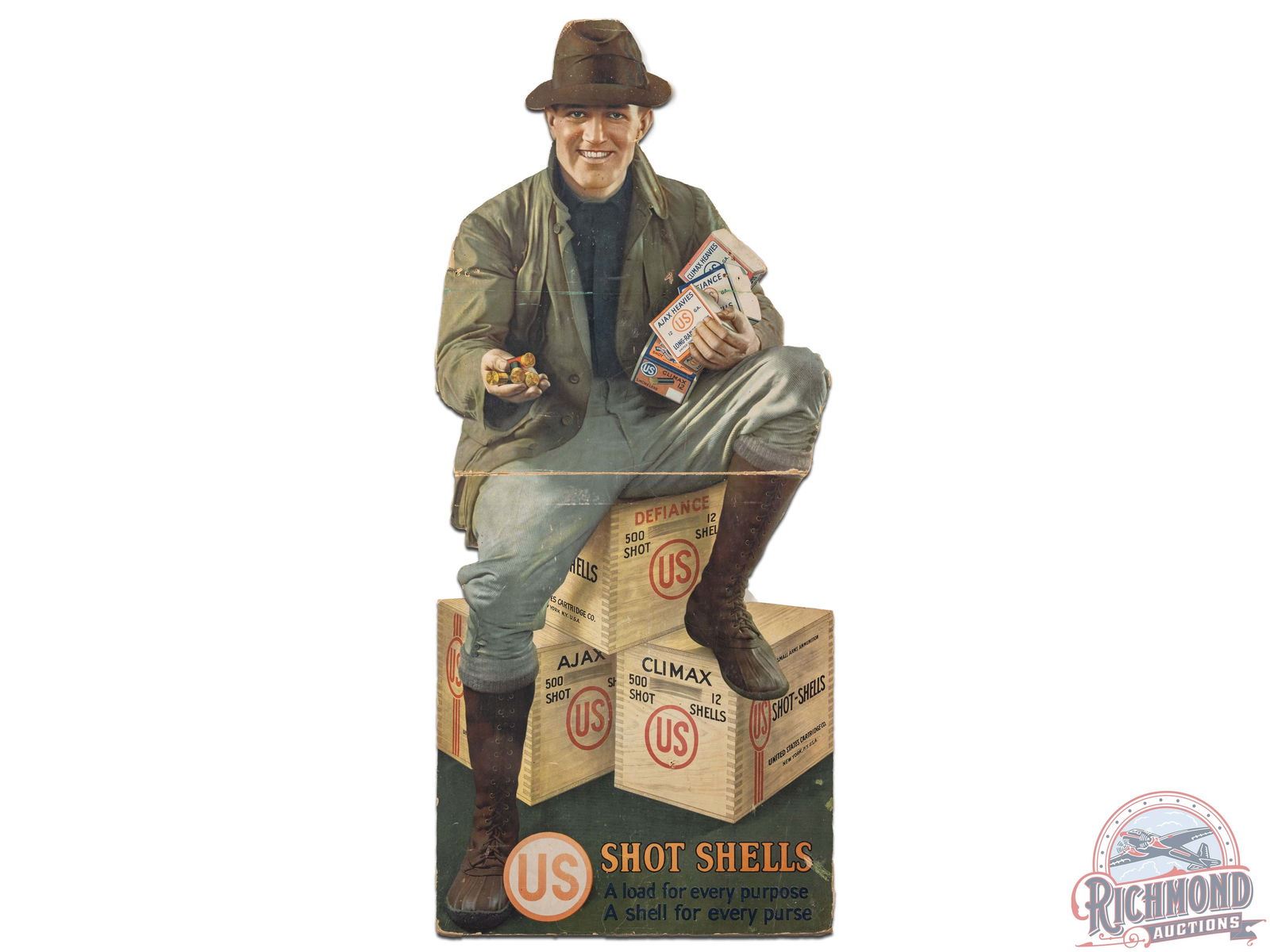 Early and hard to find fold out display featuring a hunter with boxes of Defiance, Ajax Heavies, Climax Heavies and Climax 12 gauge shotgun shells while sitting on crates of the same. Striking detail in this piece. Exhibits wear including multiple indentions that have broken the surface, general paper loss, errant paint and creasing. One full crease across the face. Shrink wrapped and secured to foamboard. 44.5" H x 19.25" W.
