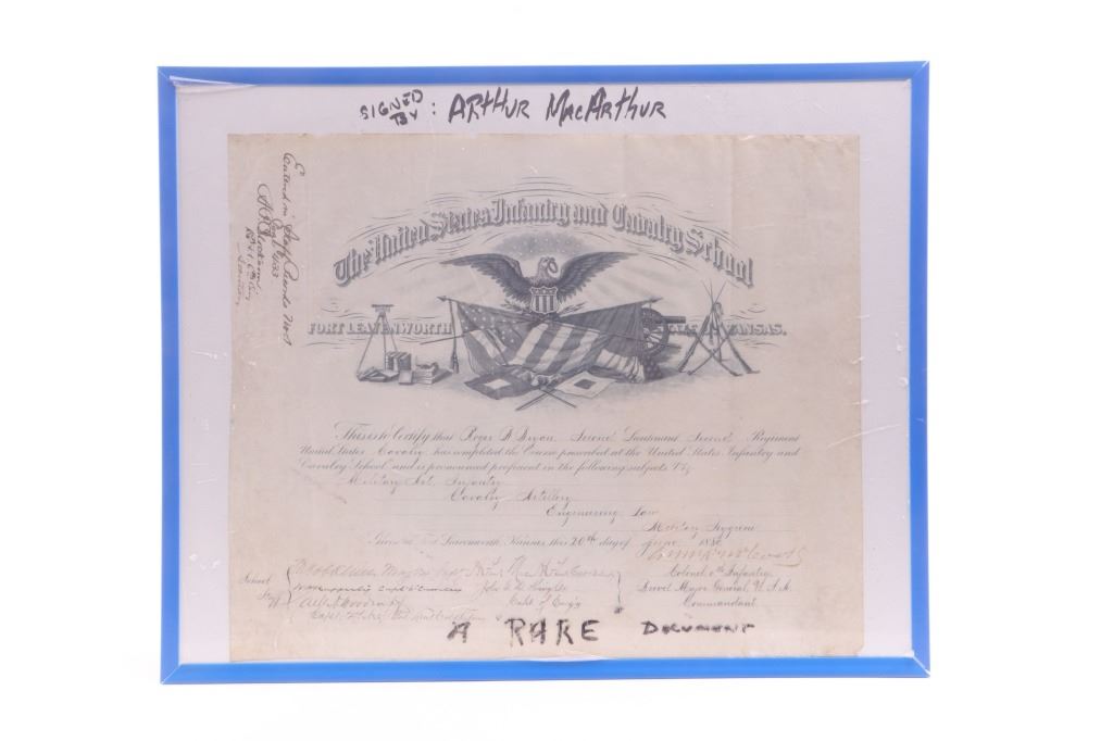This is a phenomenal, expansive lifetime of military service collection of photos, documents, and artifacts from the life of Captain Roger Bates Bryan, originating from the mid to late 1800's. Roger Bates Bryan (1860 - 1926) graduated from West Point military academy in 1882 and was first assigned to Ft. Custer, MT in 1883. Throughout his career, he was appointed to 1st Lieutenant in 1890 and Captain in 1899. He eventually went on to publish an autobiography titled "An Average American Army Officer". The collection features Roger Bryan's personal effects, including his original Government Issue personal effects, such as gauntlets gloves, spurs, collar, military belt with its original brass U.S. Cavalry buckle, U.S. Captain shoulder straps, U.S. cap insignia, U.S. Dress shoulder knots, and U.S. officers cap, as well as a copy of his autobiography "An Average American Army Officer"—all finely displayed in a wood and glass curio case with red velvet bottom. The collection also comes with three Presidential signed promotion letters hand signed by Chester Arthur, Benjamin Harrison, and William McKinley, and a letter signed by Arthur MacArthur (father to Douglas McArthur, one of only five men promoted to the five-star rank of General of the Army during WWII). The collection comes with a set of twelve black and white military photographs from 1883-1899 showing his West Point Graduation, Cadet Appointment, Completion of Cavalry School in Ft. Leavenworth, Appointments to 1st Lieutenant and Captain, and an 1896 law certificate. The piece comes with a photo of his wife with her obituary, pictures of his son, his wife's family, and original letters. This collection offers a wonderful look into the life of a U.S. Army Officer from the late 1800's. The collection shows good condition overall, with some wear due to age. Additional photographs and ephemera are included, documenting his life. Provenance: From the ex-collection of Jim Aplan from Piedmont, South Dakota. The display case measures 18" deep by 22 1/2" wide and 6" tall.