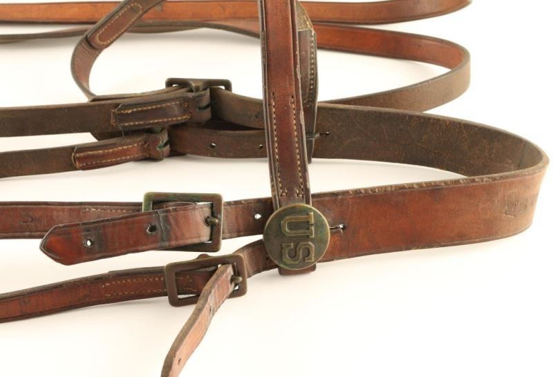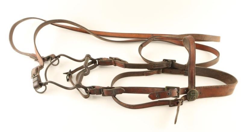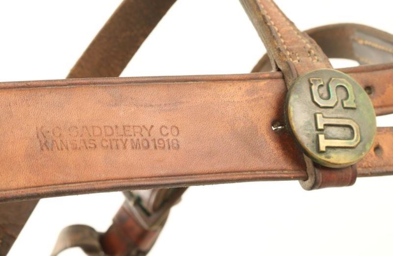 1919 Park Service headstall with US medallions. Marked "KC Saddlery Co. Kansas City, MO 1919". Good condition, shows some use and age.
