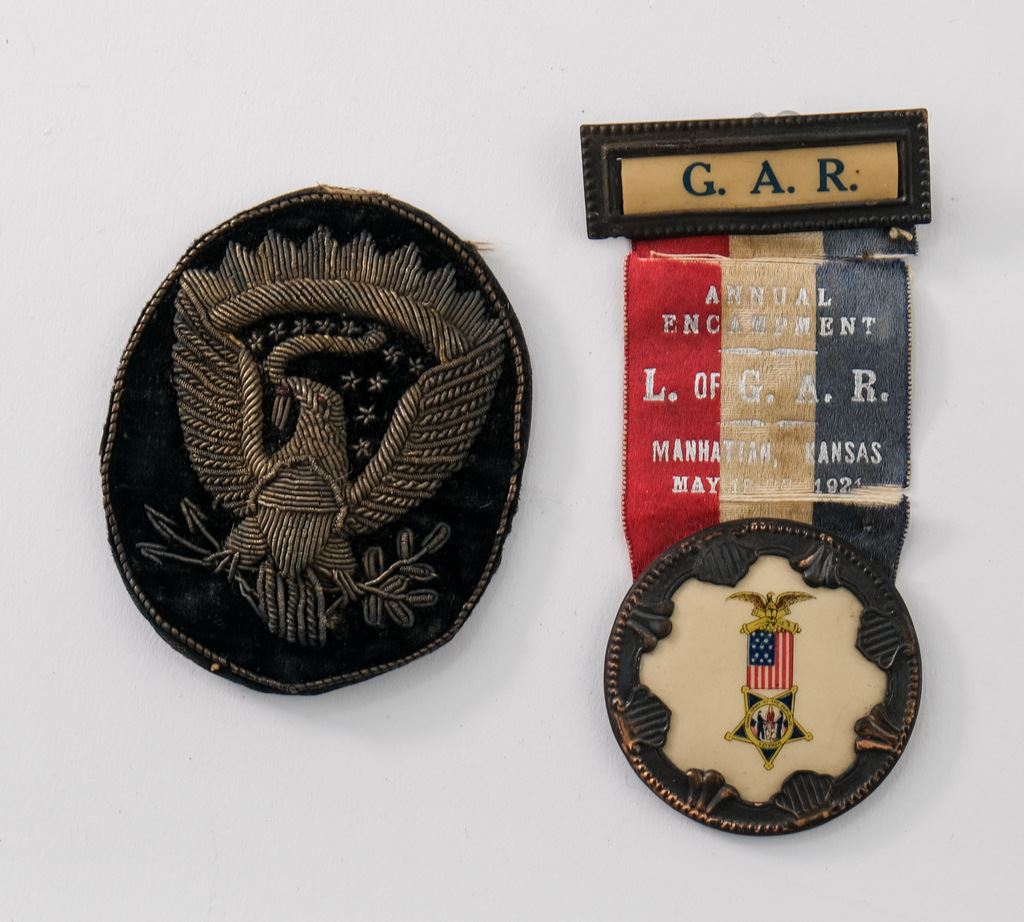 Includes a Veteran silver star pin, Embroidered heart, Crescent and Diamond Patches, a GAR Encampment ribbon with medal (as-is), and an original Officers Embroidered Gold Bullion Hat Insignia with Eagle.