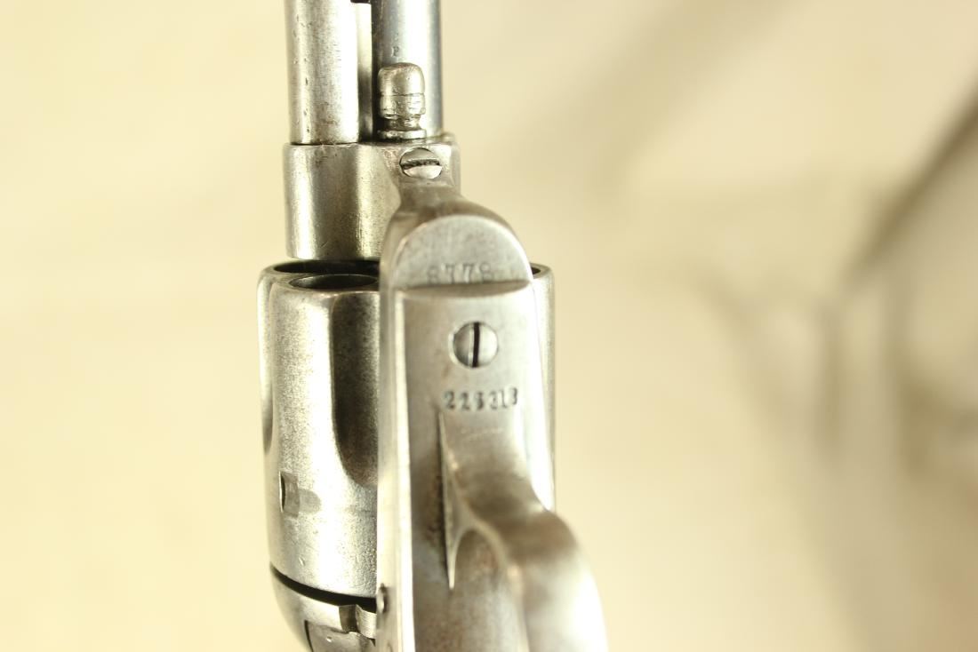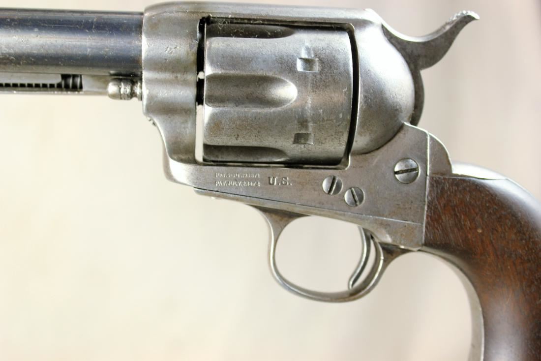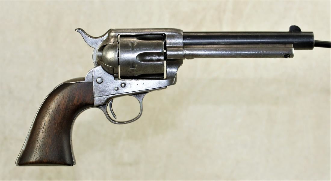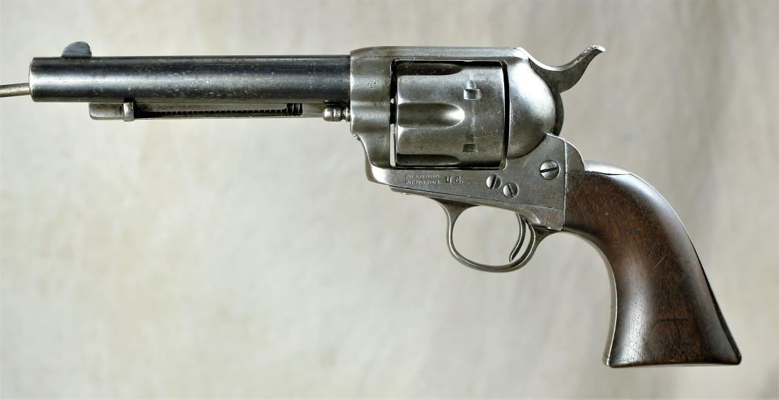 U.S. Colt Model 1873 Single Action ''Artillary'' Cartridge Revolver, frame #8778 (mfg'd 1874) with two-line patent dates and bold U.S. marking, other serial numbers mixed (no number on butt), .45 Colt cal., 5.5'' round barrel with one-line Hartford address, blue and case hardened finish, one-piece walnut grips, and steel grip straps. Condition is good to very good showing overall smooth metal; most of a later reblue remains on barrel. Grips are smooth, solid and very good, showing light inspector cartouches on both sides. Smooth, tight action, and clean bore.