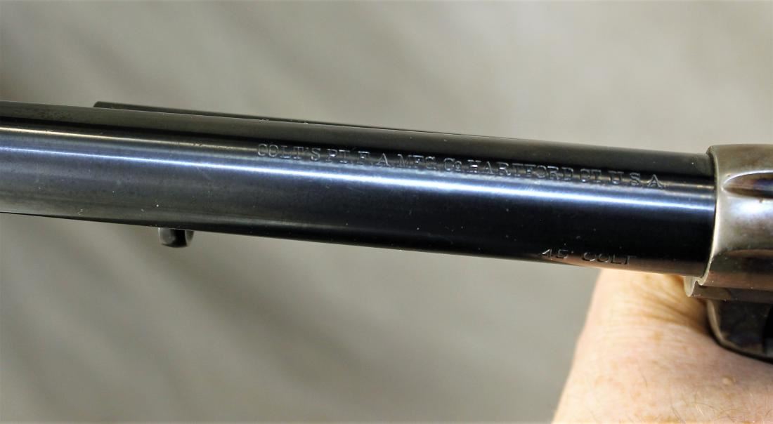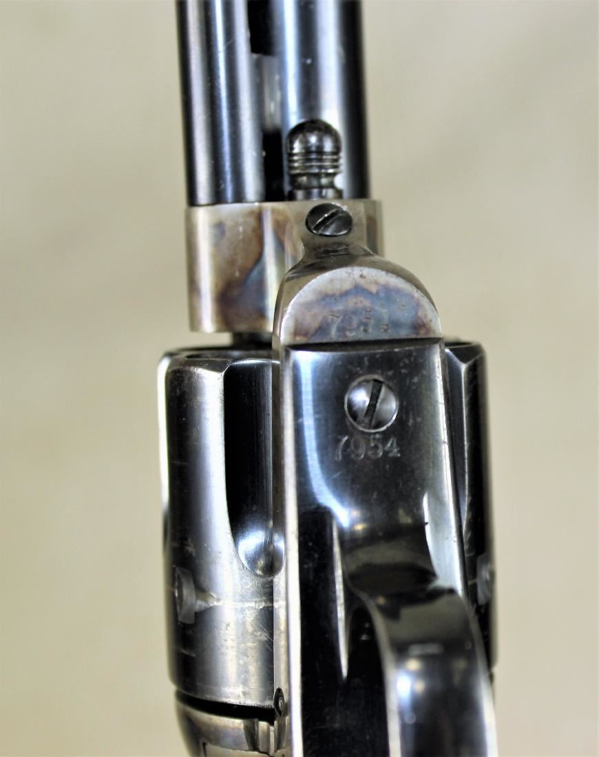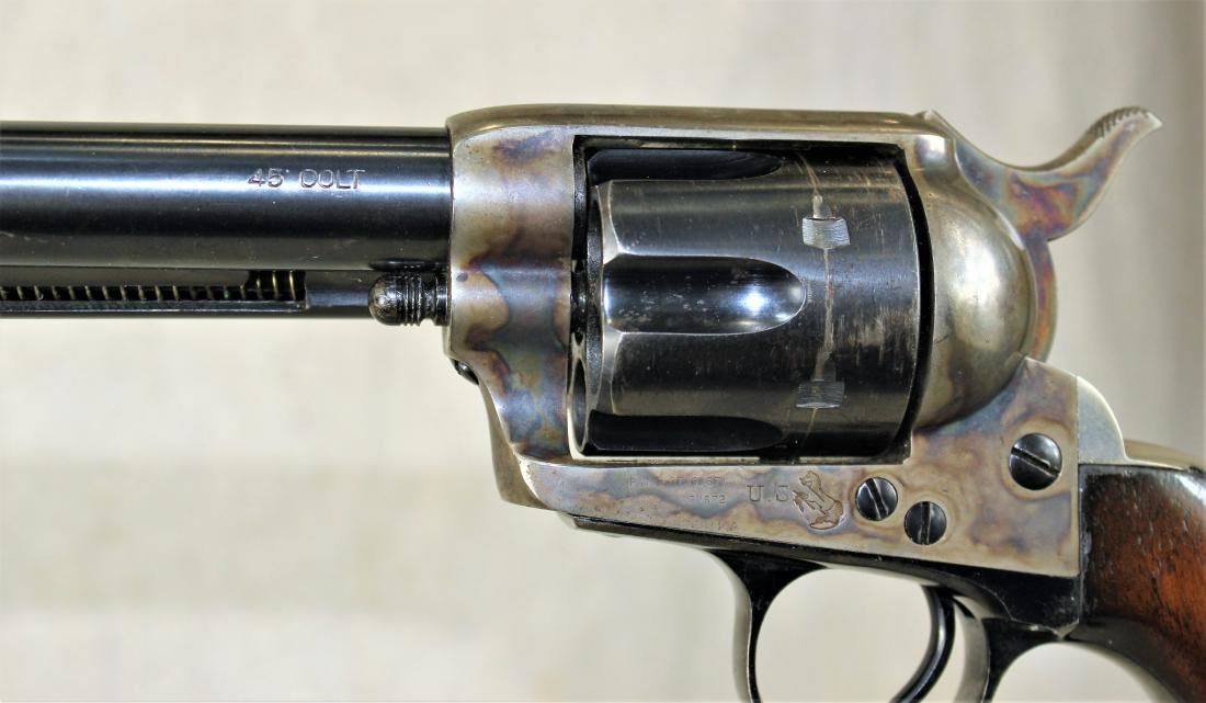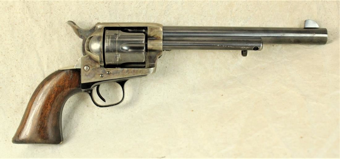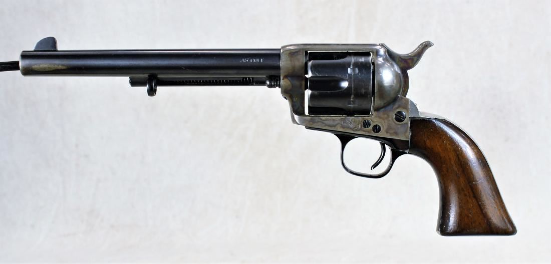 Interesting early Colt single action revolver with 4 digit Custer serial range number with spurious, "US" mark on side of frame and attractive walnut grips. In 45 caliber, with 7 1/2" barrel. A finely refinished Colt showing the majority of it's case color and blue finish, apparently using all original Colt parts.