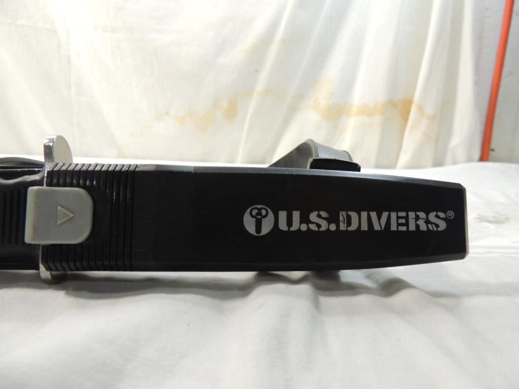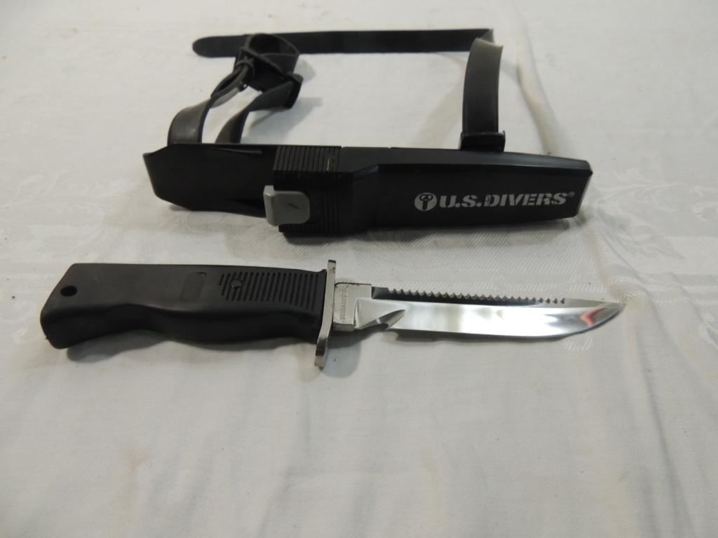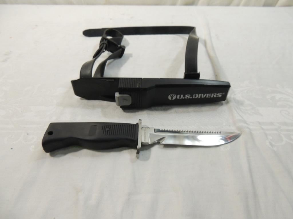US DIVERS KNIFE WITH SHEATH, LEG SHEATH, DIVERS KNIFE AS SHOWN SEE PHOTO FOR MORE DETAILS.