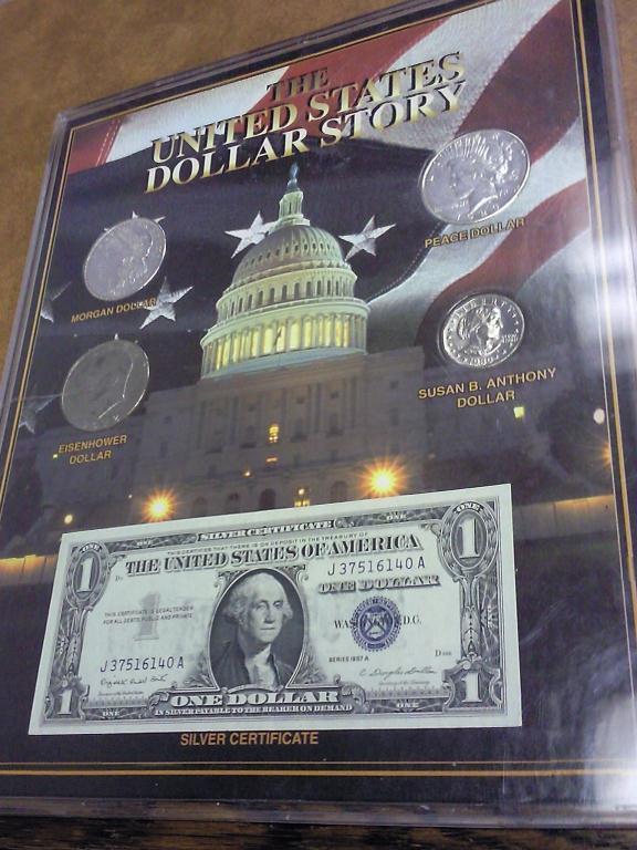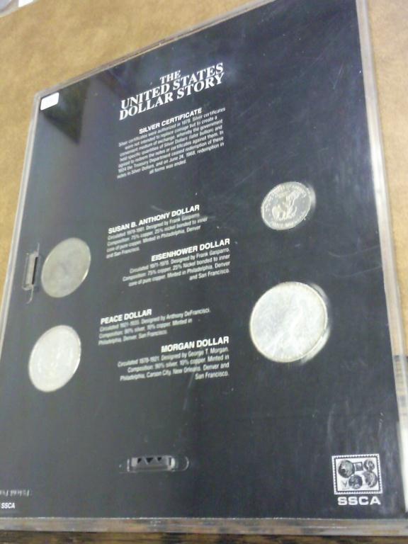 MORGAN SILVER DOLLAR, PEACE SILVER DOLLAR, IKE DOLLAR, SBA DOLLAR AND 1957-A $1 SILVER CERT. UNC