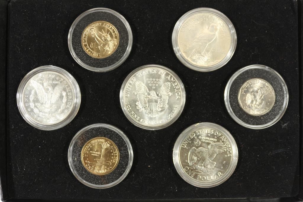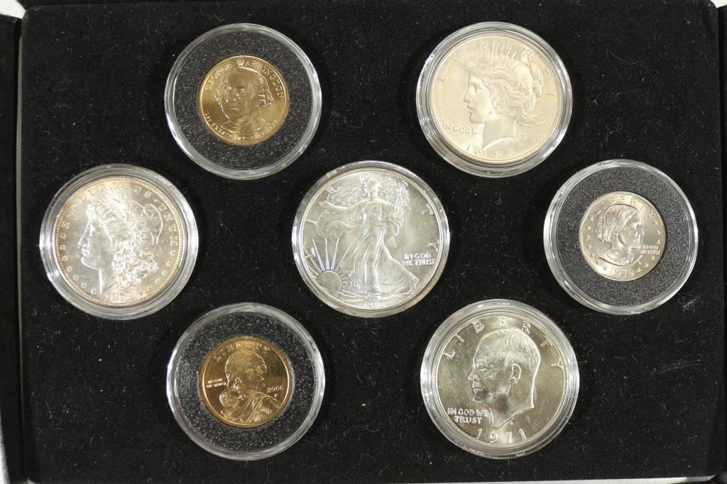 SILVER DOLLAR, 1922 PEACE SILVER DOLLAR, 1971-S IKE SILVER DOLLAR, 1986 AMERICAN SILVER EAGLE, 1979-S SBA DOLLAR, 2000-P SACAGAWEA DOLLAR AND 2007 GEORGE WASHINGTON DOLLAR. 7 COINS TOTAL