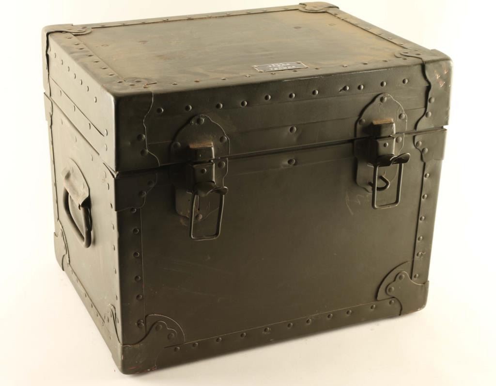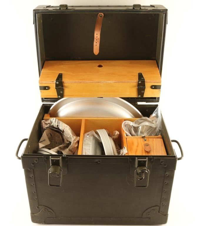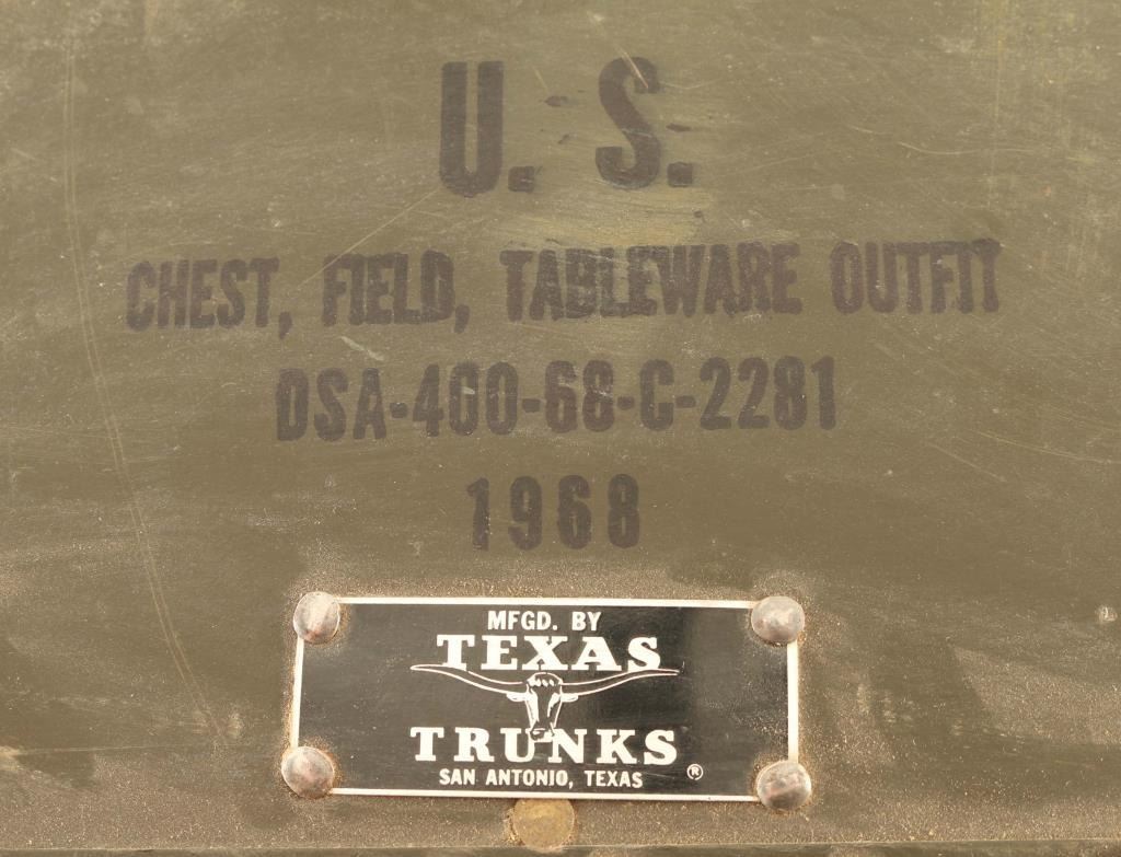 Lot includes a mess kit inside a dark olive green 17 1/2" x 14 1/2 x 13" box marked "US / Chest. Field. Table Wear Outfit / DSA-400-68-C-2281 / 1968". Appears to have most of if not all of its original contents. In very good condition.