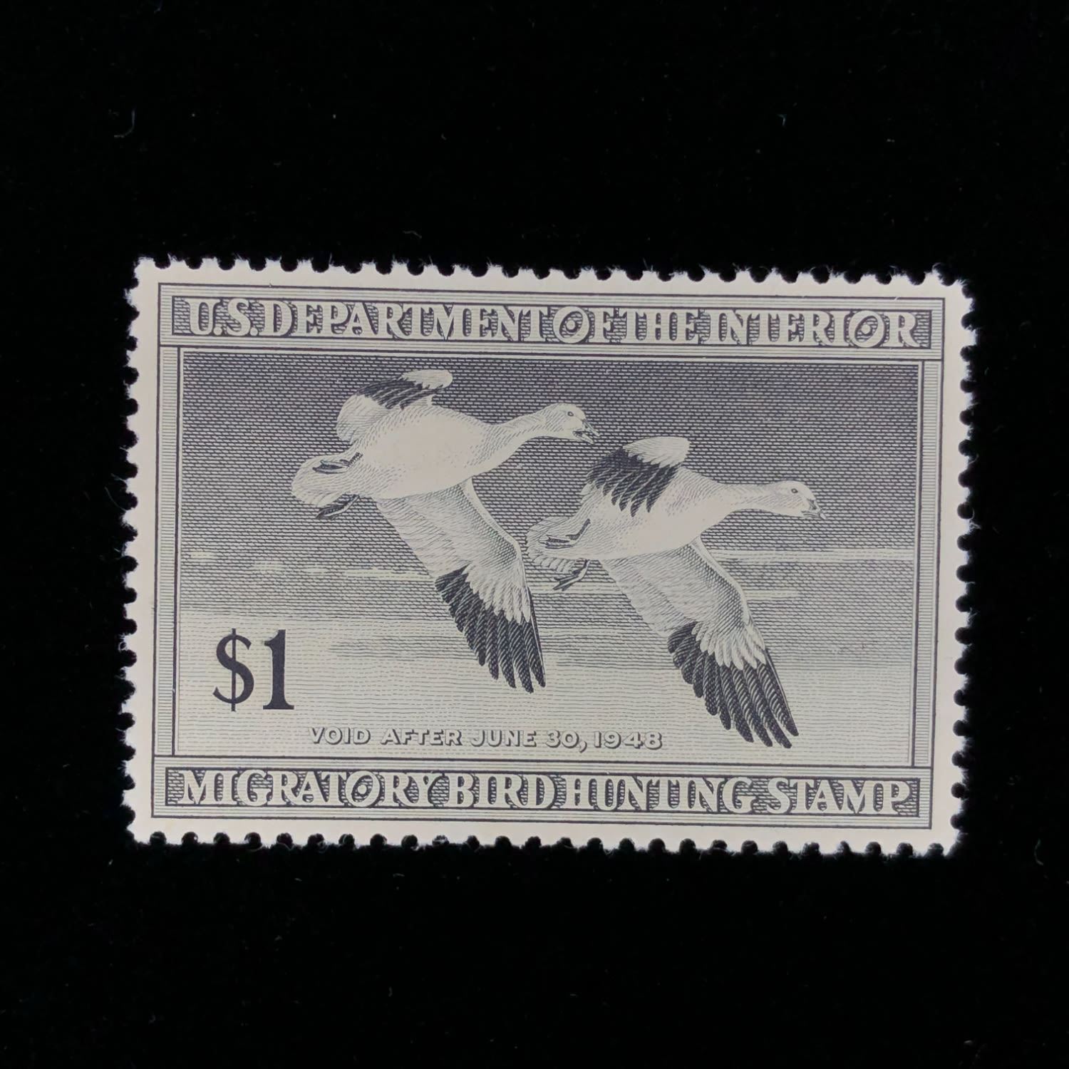 US Duck Stamp 1947 RW14 Mint OGNH in XFS condition. A wonderful Federal duck stamp in Black with deep color, well centered margins and superb eye appeal. Very nice!