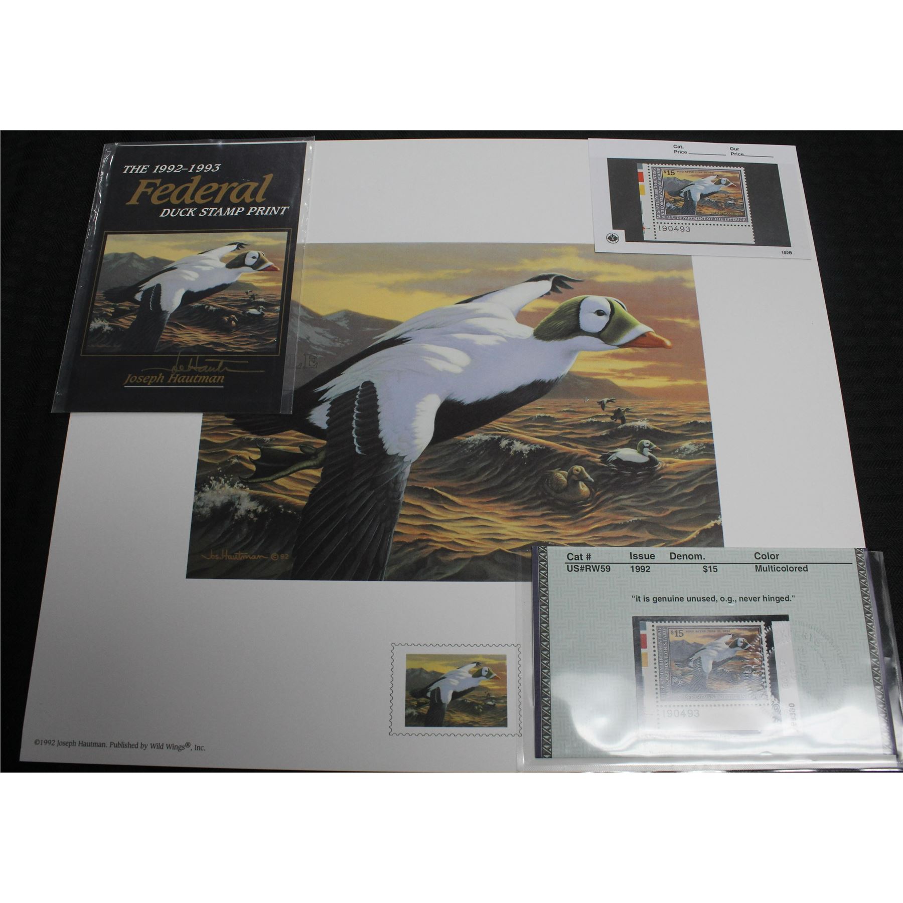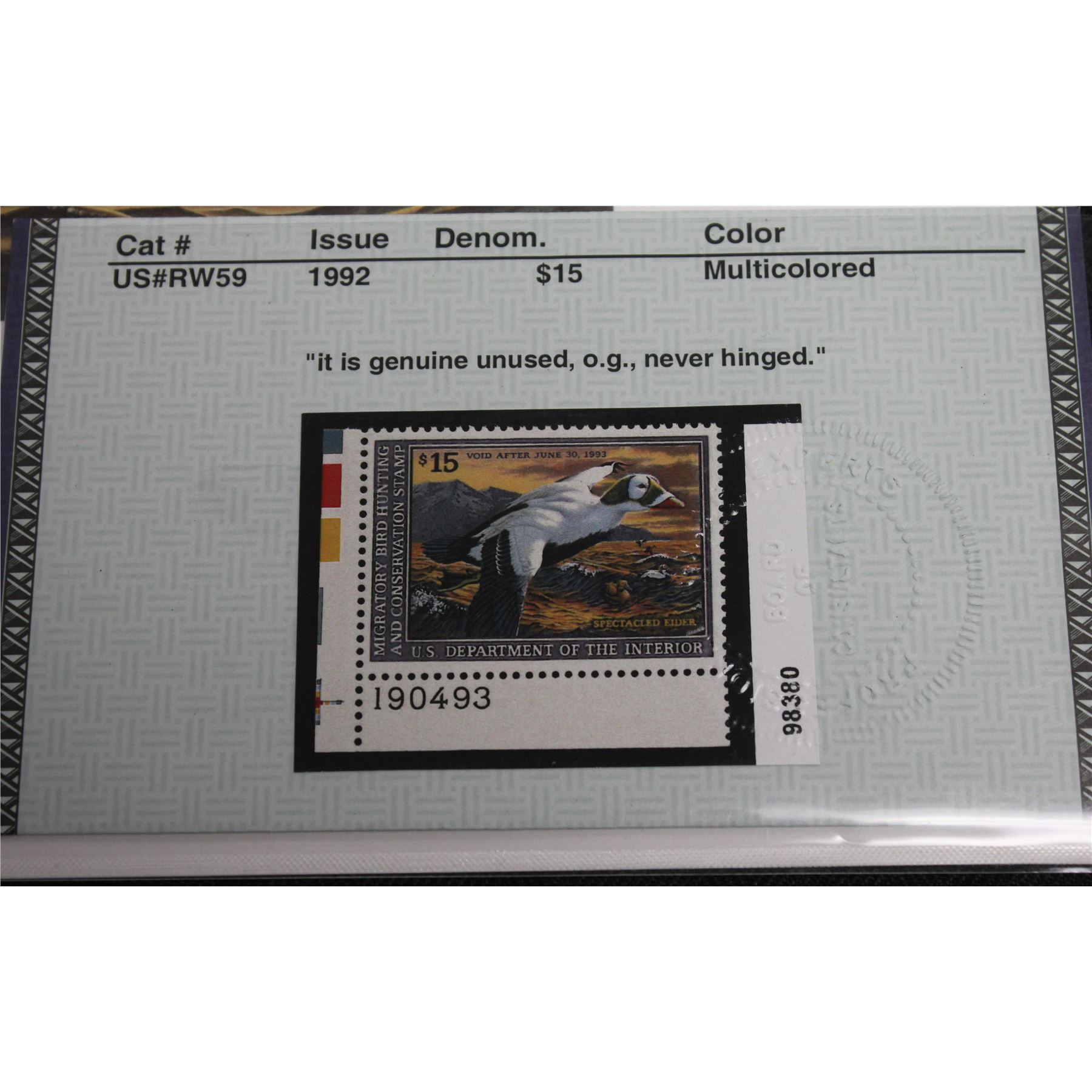 The only modern US Federal Duck Stamp rated a 2X rarity By PSE, this SC#RW59 XFS with PSE certificate is accompanied by an Artist Proof card and a artist appreciation card. (AAP card) A wonderful item for displaying this multi-color, best of the modern Ducks!
