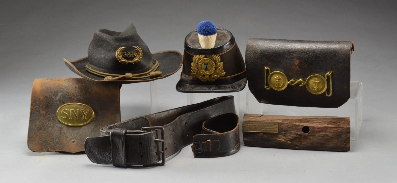 & MORE. 1) GAR HAT. A nice example of a GAR slouch hat in black w/ a metal GAR hat wreath & circa 1900 hat cord. Leather sweatband. CONDITION: light to moderate wear. 2) CANTEEN. A tin canteen, 6" in diameter w/ a tin screw top. Canteen is covered in a red velvet like material. CONDITION: light to moderate wear. 3) CARTRIDGE BOX. A circa 1830 leather cartridge box, possibly of French mfg. Box is not carried on a belt but rather a sling. There are 2 iron sling buckles on the base & 1 for the closing strap. Attached to the front of the box is a 2 piece French naval buckle w/ a snake type “S” closure. Buckle has anchors on each half. Interior is an open wooden box. CONDITION: cartridge box has several extra holes on the front & is dry & crazed. There are scattered tears & open seams, however the box is substantially complete. 4) NECK STOCK. A circa 1850 leather neck stock w/ a black painted tin buckle. Attachment strap appears to be a bit shortened. CONDITION: light wear. 5) CARTRIDGE BOX. A Civil War 58 cal. cartridge box w/ no tins. The buckle on the front is an “SNY”. CONDITION: box generally shows moderate to heavy wear. 1 Buckle is missing on the bottom. Significant finish is gone. 6) HAT. A circa 1872 New York 7th National Guard hat. Front has the standard 7th NY hat plate & the pompom is white & blue. Side buttons are 1872 infantry horns. Interior label reads in part, “GEO. W. SIMMONS & SON, MANUFACTURERS OF MILITARY REGALIA”. CONDITION: hat shows light to moderate wear overall. 7) BELT. A lg. leather belt measuring nearly 3" wide w/ a lg. iron roller buckle. Belt is possibly a waist belt but is also possibly horse tack. CONDITION: belt is quite stiff though remains solid. 8) WOODEN RELIC. A 9 1/4" piece of wood w/ a brass plaque attached that reads, “THIS MATERIAL WAS TAKEN FROM THE ORIGINAL HULL OF THE U.S. FRIGATE CONSTITUTION KEEL LAID 1794 REBUILDING 1927”. CONDITION: light wear. (02-14443-2/BF). $900-1,300.