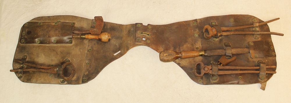 A scarce US Cavalry set of farriers tools and carrier, marked "US Fifth Cav Lt.". Complete with its seven period tools. A great original piece.