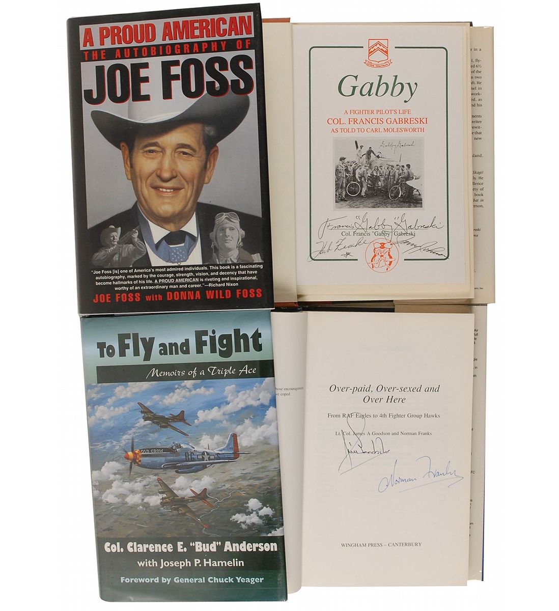 Four hardcover books: To Fly and Fight, signed on the first free end page by C. E. ‘Bud’ Anderson; Over-Paid, Over-Sexed and Over Here, signed on the title page by James A. Goodson and Norman Franks; Gabby, signed on a detached bookplate by Gabby Gabreski, Hub Zemke, and Jerry Johnson; and A Proud American, signed on the first free end page by Joe Foss. In overall fine condition.