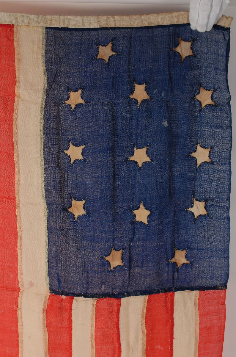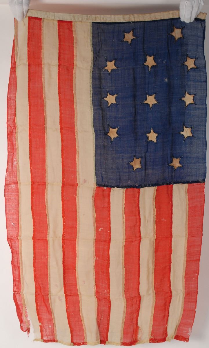 Hand-stitched wool bunting flag with thirteen stars and thirteen stripes, made circa 1850–1870, measuring 49 x 30.25 overall with a 23 x 17.25 canton. The bunting is woven from machine spun threads and has a tubular linen hoist measuring approximately 1? in diameter and having stitched grommets on the ends. The single-sided stars are arranged in an unusual pattern: a horizontal line of three surrounded by two mirrored arches of five stars. The stars are white linen with exposed stitching on the reverse. The flag has small holes through the bunting scattered regularly about the fabric and there is moderate fraying and tattering along the edge of the reinforced fly. Additionally, there are spots what may be old dried glue along the some of the fly. The colors have faded over time to attractive, mellow-toned hues with brown toning to the stars. This is an attractive mid 19th century flag and is in good-near very good overall condition.