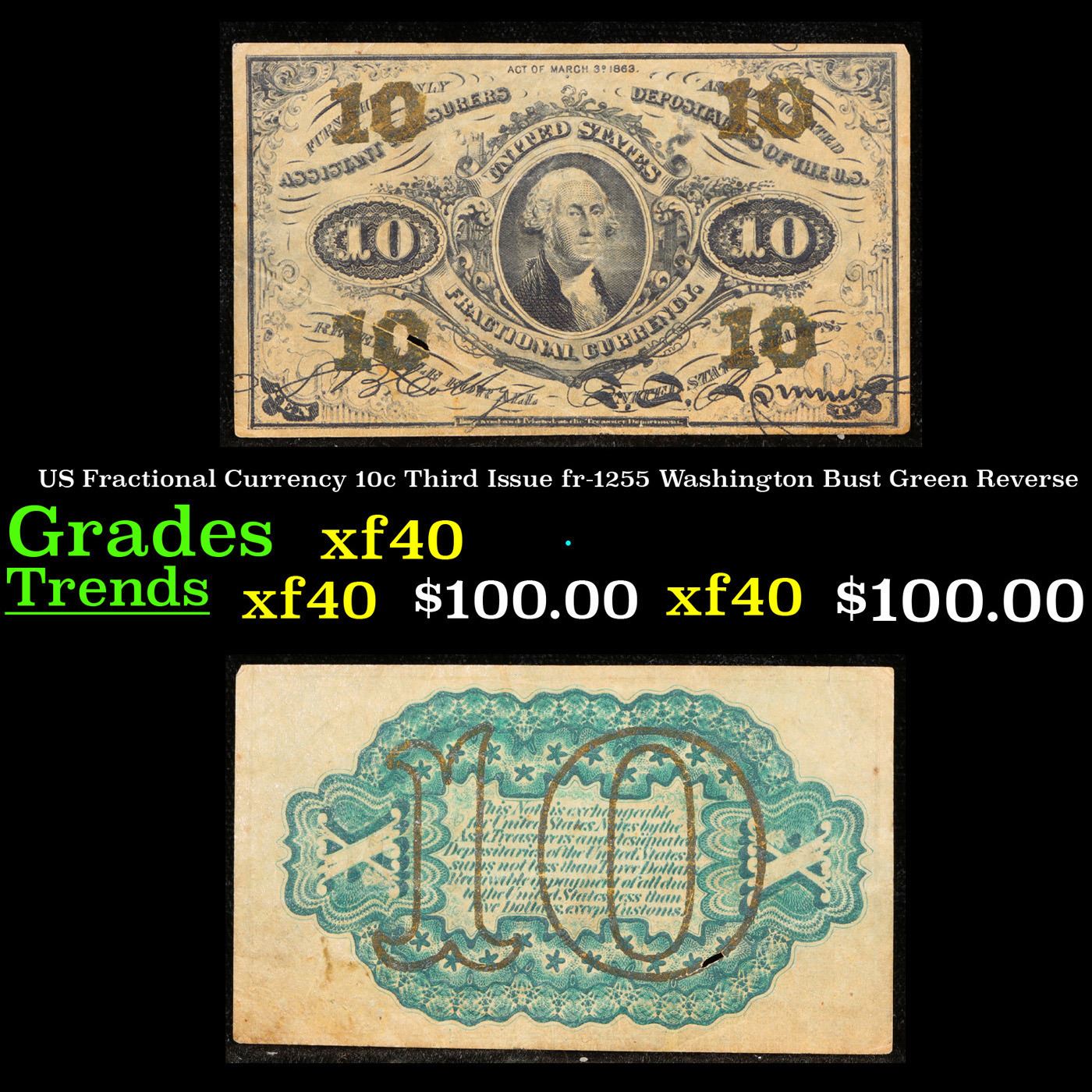 US Fractional Currency 10c Third Issue fr-1255 Washington Bust Green Reverse Grades xf.