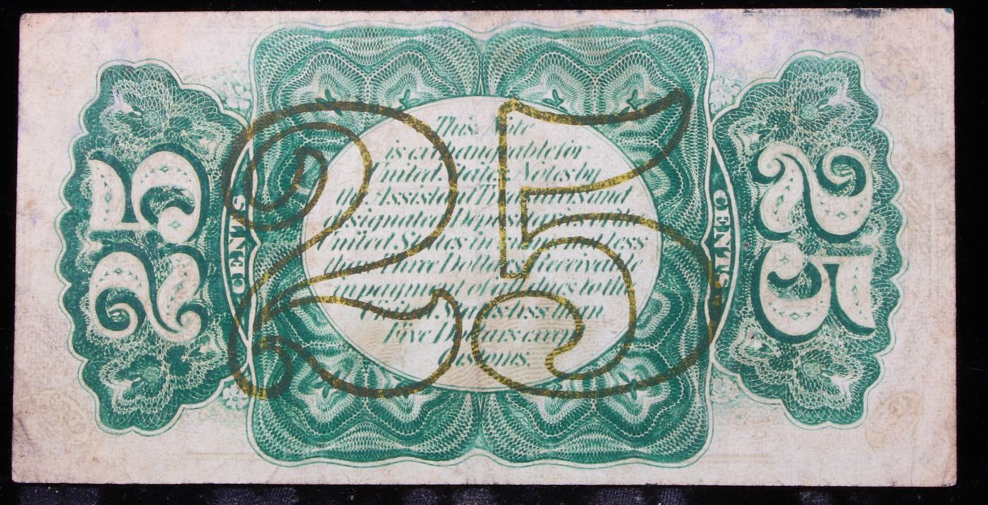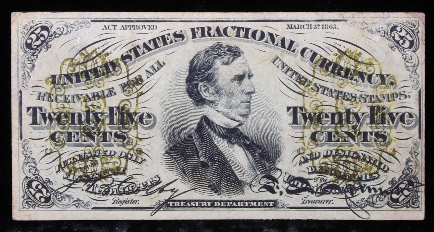 US Fractional Currency 25c Third Issue fr-1295 "a" on front Bust of Wm Fessenden Green Rev Grades Select AU. Fractional or postage currency has a rich history. At the beginning of the Civil War people starting hoarding coins for their precious metal content. Coins became difficult to find because of the hoarding. People started to try to use stamps instead of coins as a means of commerce. The government decided to help ease the hoarding issue by issuing “paper coins” also known as postage currency or fractional currency. Fractional currency was first issued on August 21, 1862 and they were last issued on February 15, 1876. Three cents, five cents, ten cents, twenty-five cents, and fifty cents notes were all issued. Fractional currency is physically smaller than other United States money. It also does not have a serial number.