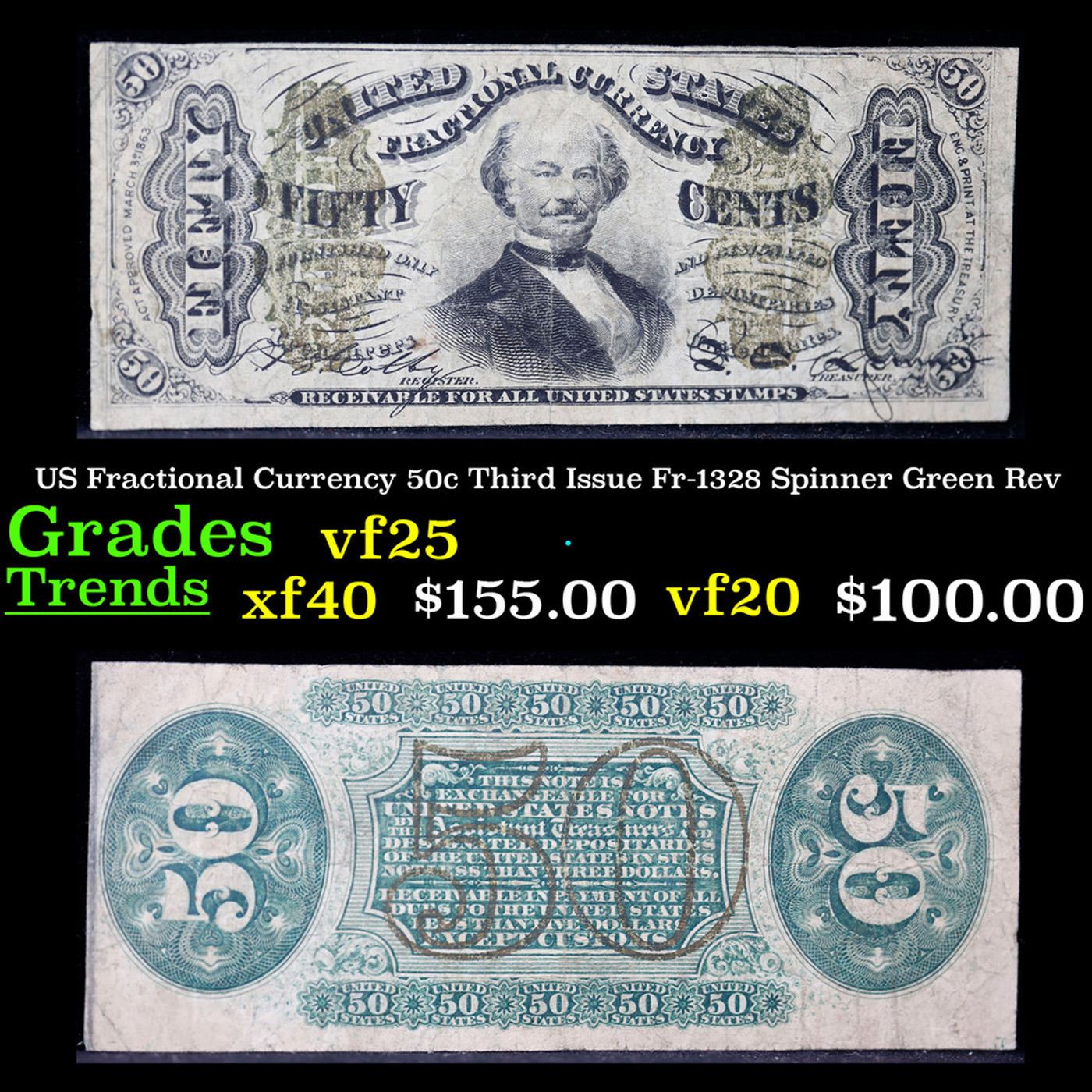 US Fractional Currency 50c Third Issue Fr-1328 Spinner Red Rev Grades vf+. Fractional or postage currency has a rich history. At the beginning of the Civil War people starting hoarding coins for their precious metal content. Coins became difficult to find because of the hoarding. People started to try to use stamps instead of coins as a means of commerce. The government decided to help ease the hoarding issue by issuing “paper coins” also known as postage currency or fractional currency. Fractional currency was first issued on August 21, 1862 and they were last issued on February 15, 1876. Three cents, five cents, ten cents, twenty-five cents, and fifty cents notes were all issued. Fractional currency is physically smaller than other United States money. It also does not have a serial number.