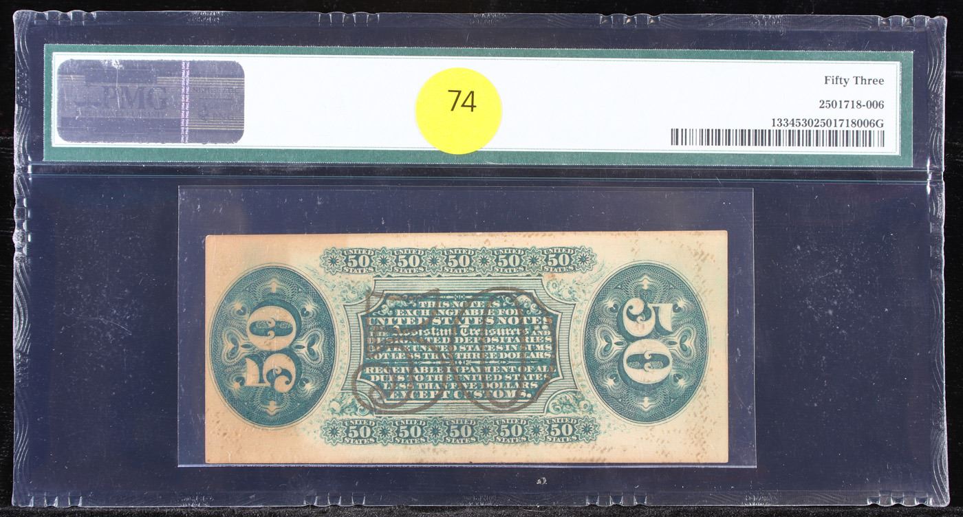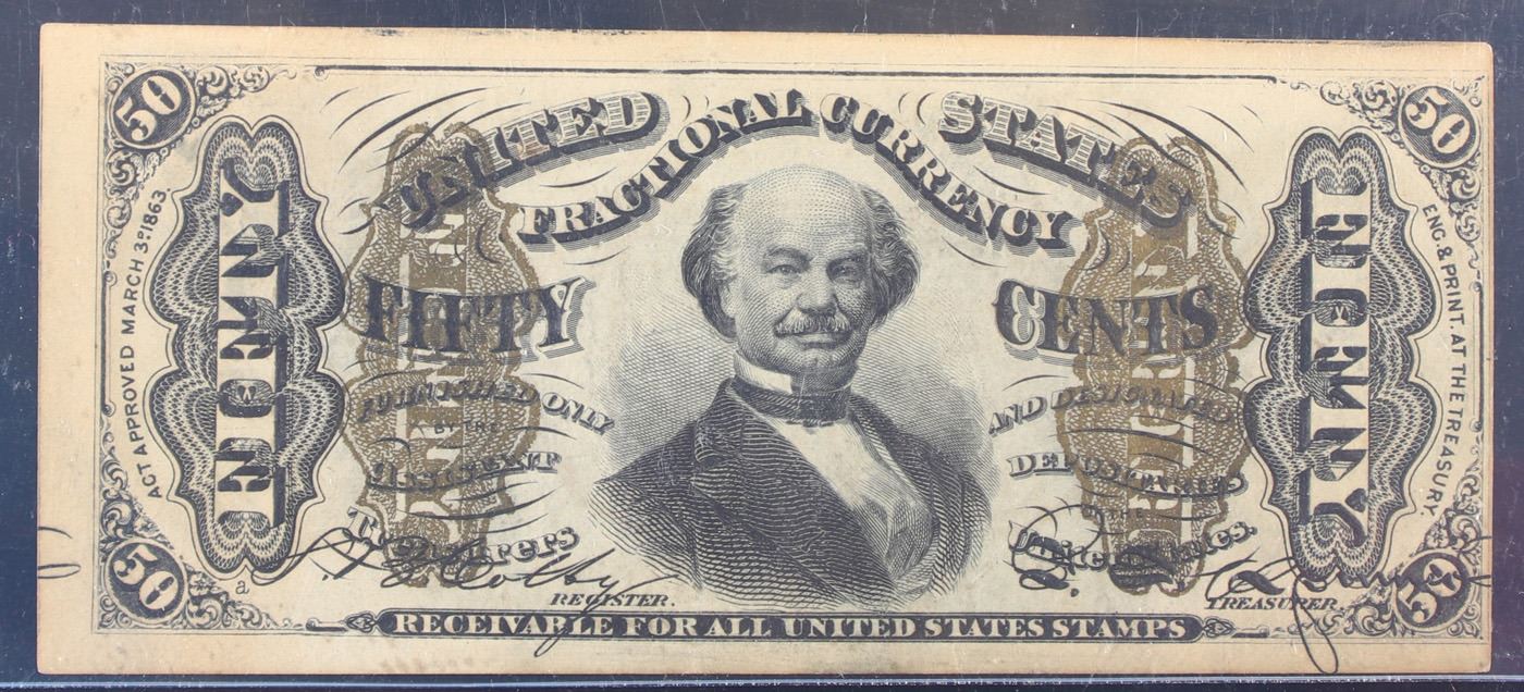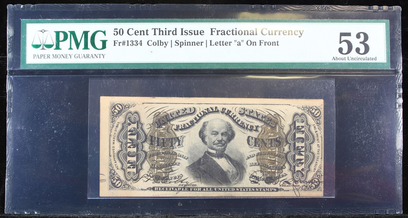 US Fractional Currency 50c Third Issue fr-1334 Francis Spinner Letter 'a' On Front Graded au53 By PMG. Fractional or postage currency has a rich history. At the beginning of the Civil War people starting hoarding coins for their precious metal content. Coins became difficult to find because of the hoarding. People started to try to use stamps instead of coins as a means of commerce. The government decided to help ease the hoarding issue by issuing “paper coins” also known as postage currency or fractional currency. Fractional currency was first issued on August 21, 1862 and they were last issued on February 15, 1876. Three cents, five cents, ten cents, twenty-five cents, and fifty cents notes were all issued. Fractional currency is physically smaller than other United States money. It also does not have a serial number.