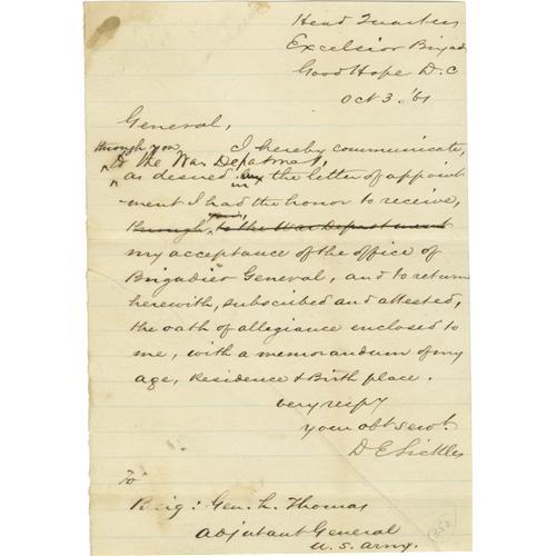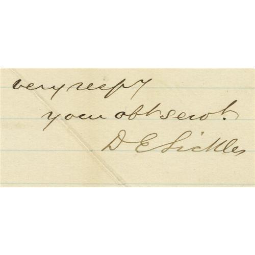 <B>U.S. General Daniel Sickles Autograph Letter Signed</B></I> "<I>D E Sickles</B></I>". One page, 5" x 7", lined paper, Good Hope, D.C., October 3, 1861, to Brigadier General L. Thomas, adjutant general, U.S. Army. In this rough draft letter, Sickles accepts his promotion to brigadier general. In full, "<I>I hereby communicate through you to the War Department as desired in the letter of appointment I had the honor to receive, several words crossed out my acceptance of the office of Brigadier General, and to return herewith, subscribed and attested, the oath of allegiance enclosed to me, with a memorandum of my age, Residence & Birth place.</B></I>" Minor folds and a bit of staining, else fine. <BR><BR><B>Provenance: </B></I><I>The William Turner Collection</B></I><BR><BR><b>Shipping:</b> Miscellaneous Collectibles, Smal (<a target="_blank" href="http://www.heritageauctions.com/common/shipping.php">view shipping information</a>)