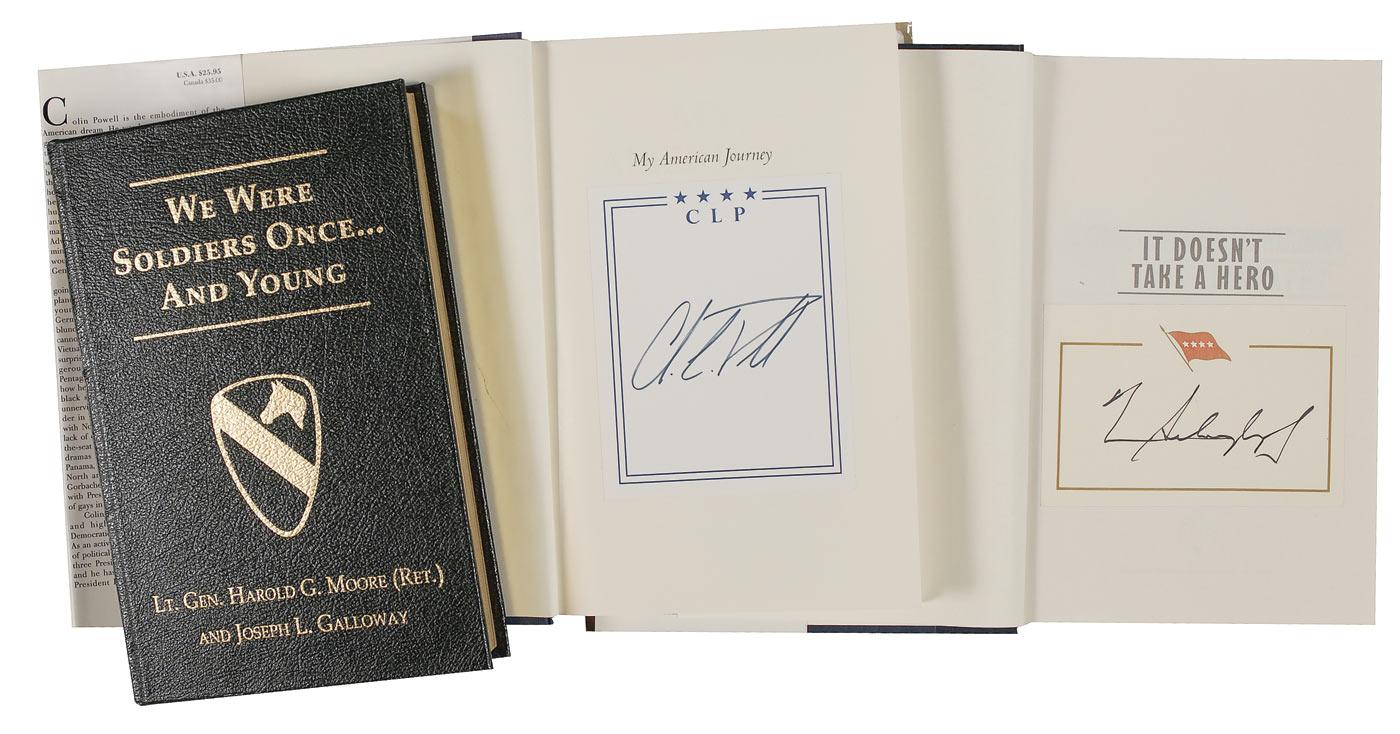 Three hardcover books, each signed by the respective author and general: It Doesn’t Take a General, signed on an affixed bookplate by Norman Schwarzkopf; My American Journal, signed an affixed bookplate by Colin Powell; and We Were Soldiers Once…And Young, signed by Harold Moore and Joseph Galloway. In fine overall condition.