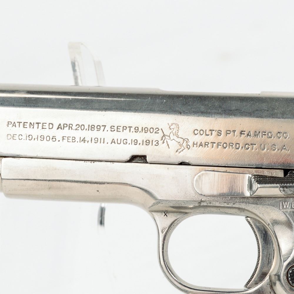 US GOV'T Colt M1911A1 .45acp pistol in good shape. This gun has been refinished in nickel, and has some scratches wear and dings. The nickel is peeling around the hammer and safeties, mag well and main spring housing. The bore is dirty but sharp and clear. It is missing the magazine. MFG 1942, C&R Eligible S/N: 784960