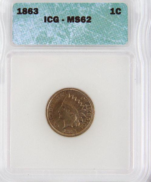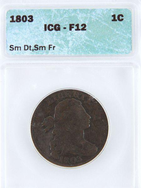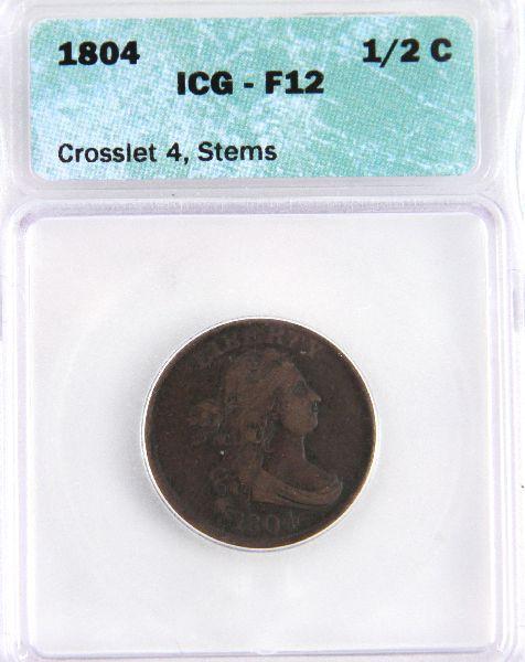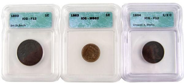 Type lot of 3 excellent, no problem early copper coins. Each ICG certified as follows: 1804 Draped Bust half cent crosslet 4 stems in F12, 1803 Draped Bust large cent with small date and small fraction in F12, and an 1863 Indian cent in MS62.