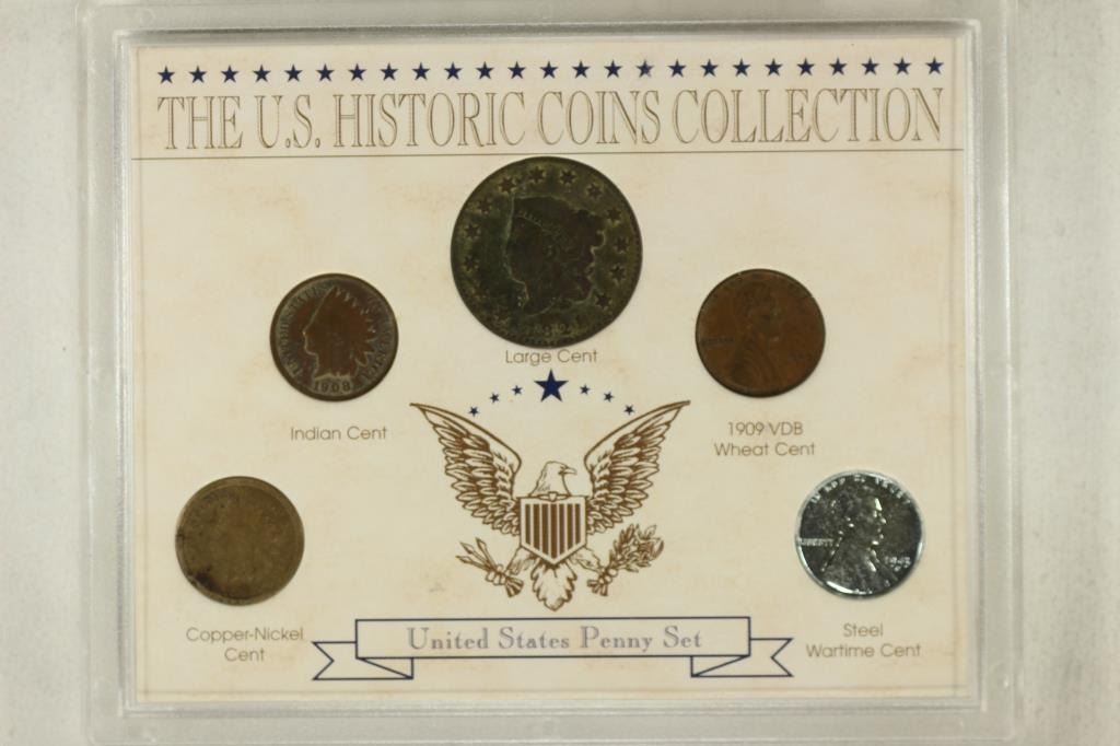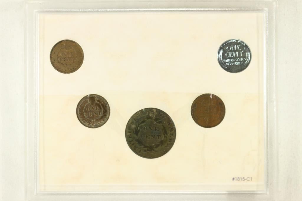 US LARGE CENT, 1863 COPPER NICKEL INDIAN HEAD CENT, 1908 INDIAN HEAD CENT, 1909 VDB LINCOLN CENT AND 1943-D STEEL WARTIIME SET