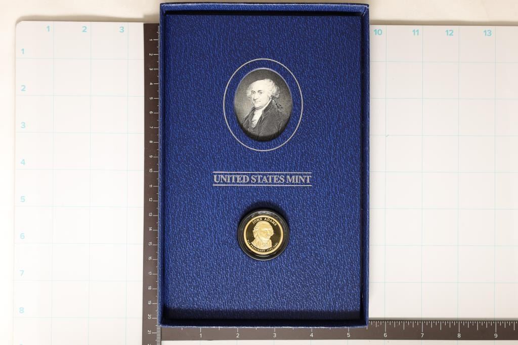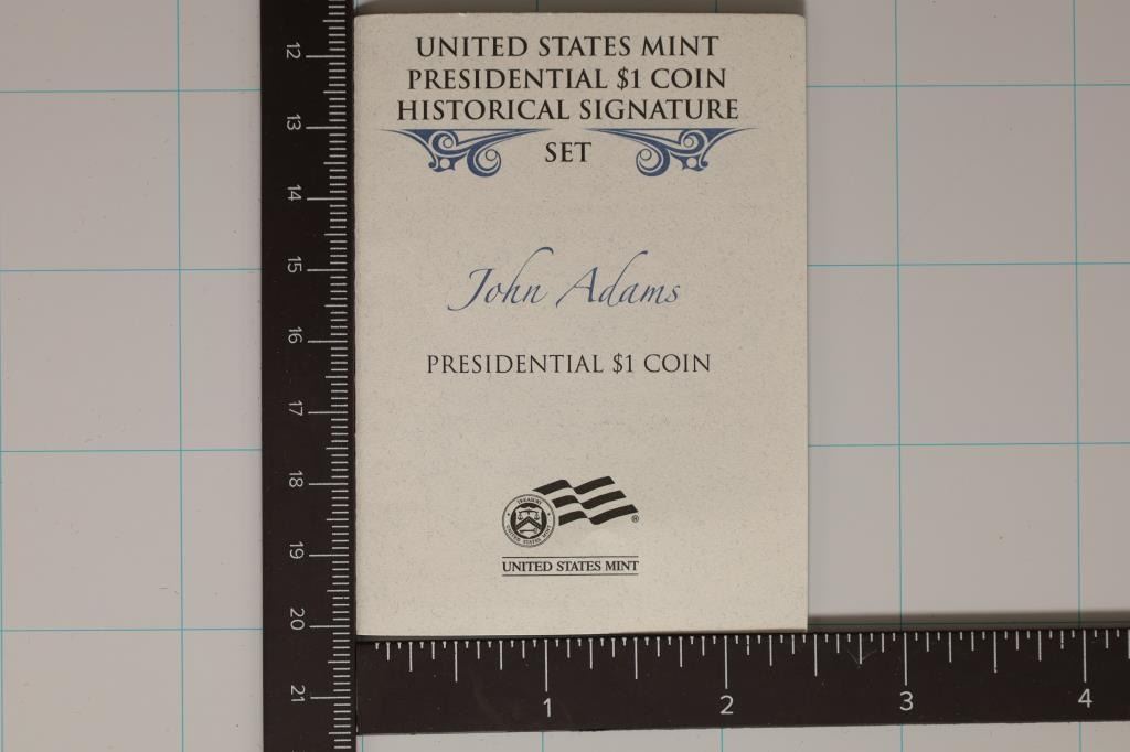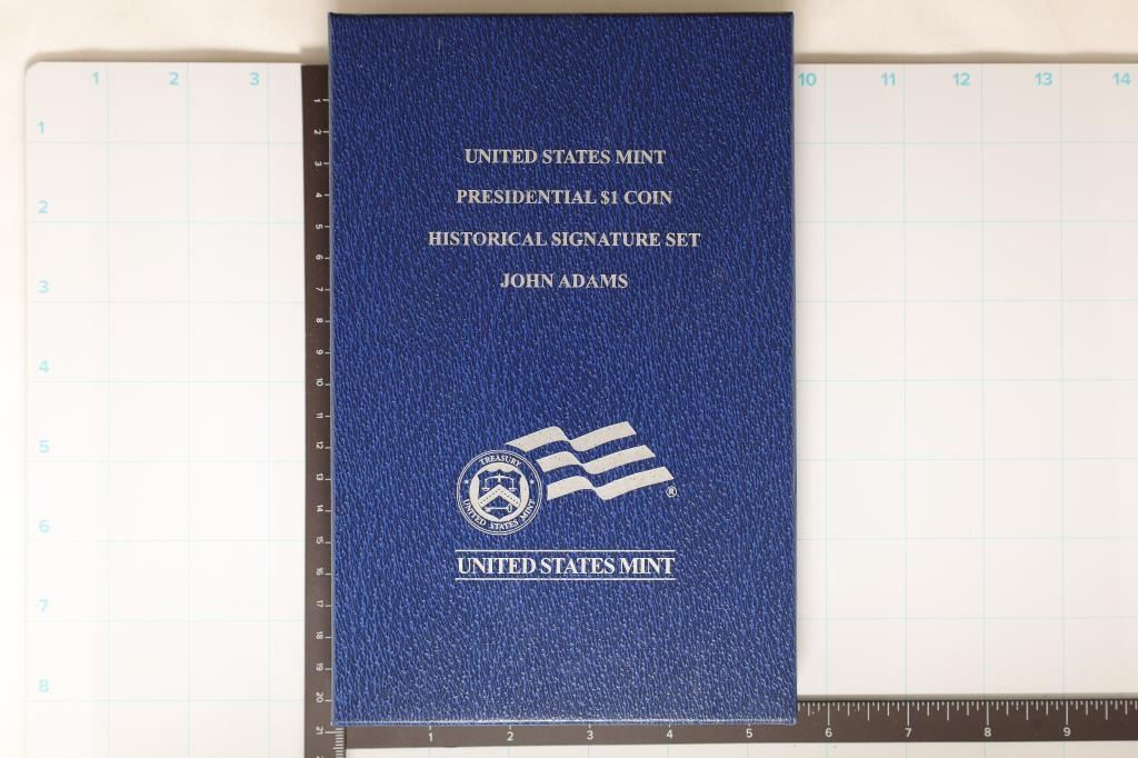 $1 COIN, JOHN ADAMS WITH PORTRAIT IN BLUE FOLIO, IN ORIGINAL US MINT PACKAGING WITH CERTIFICATE