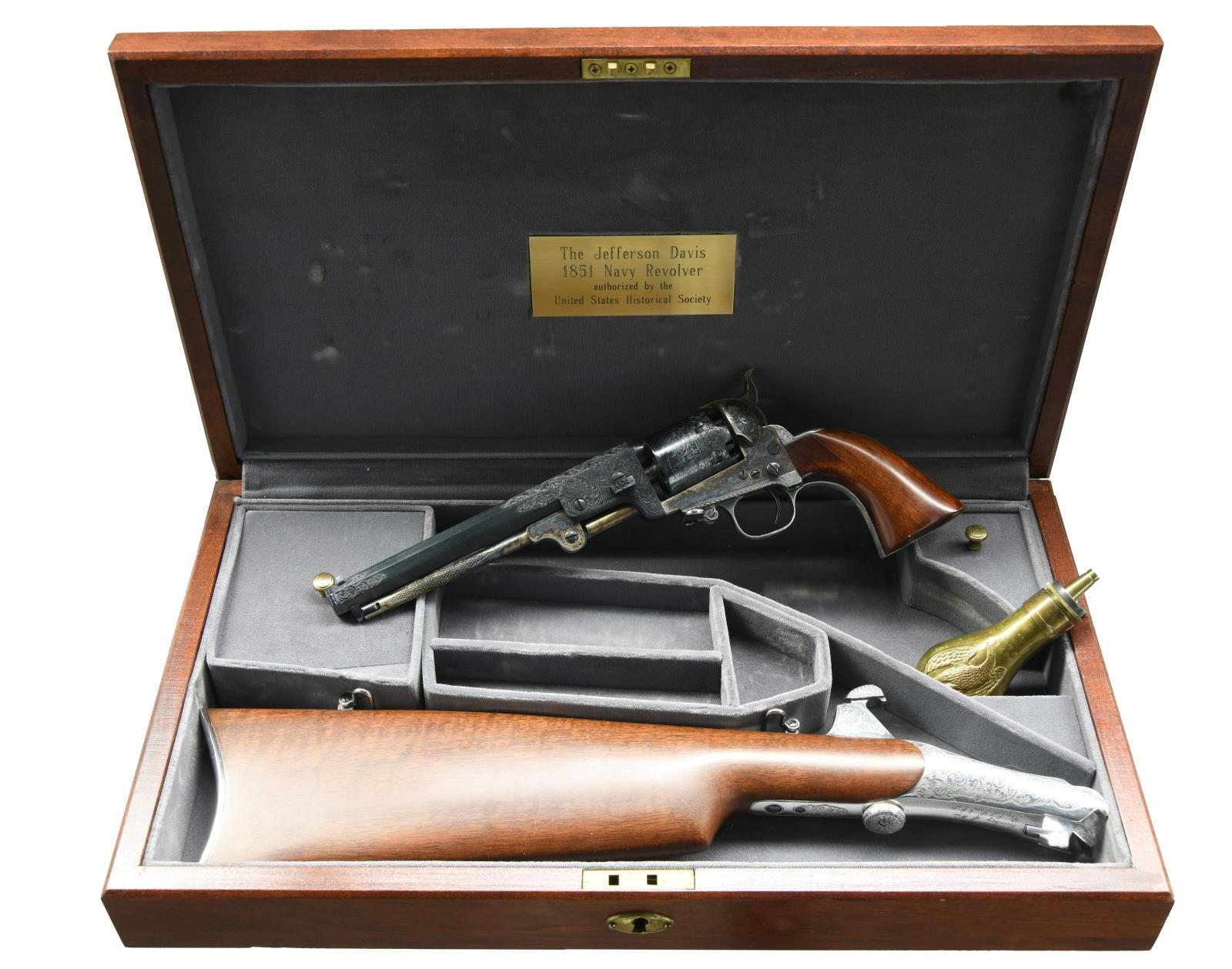 COMMEMORATIVE 1851 NAVY REVOLVER. Cal. 36. S# 655. Bbl. 7 1/2" oct. Rounded blade front sight. Replica of the revolver presented by Sam Colt to Jefferson Davis when he was secretary of war. Backstrap has inscription from Sam Colt to Jeff Davis. Blued finish bbl. & cyl. Cyl. has naval scene. Silver plated grip frame & trigger guard. Case colored hammer, frame & loading lever. Balance of metal has floral engraving. Walnut grips. UNATTACHED ACCESSORIES: detachable walnut buttstock w/ engraving from Sam Colt to Jefferson Davis & engraving. Also included are a velvet lined display case w/ key, bullet mould, CSA logo tin, powder flask & additional suitcase style carrying case. CONDITION: all aspects near excellent w/ some light handling marks. (01-23825/MJC). ANTIQUE. $1200-1800.