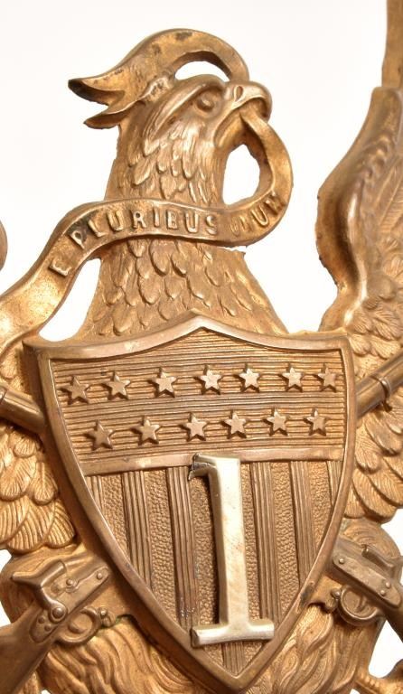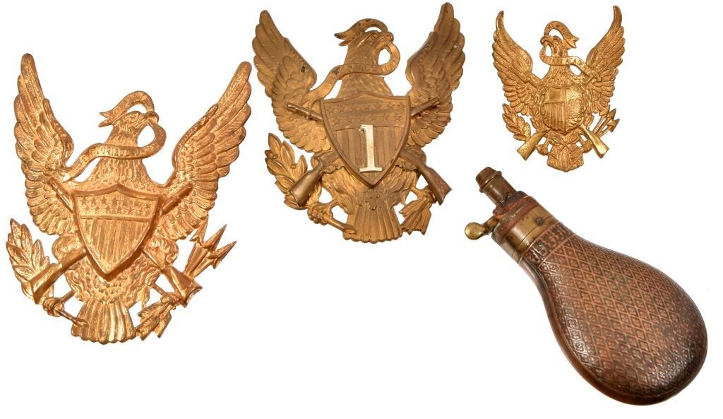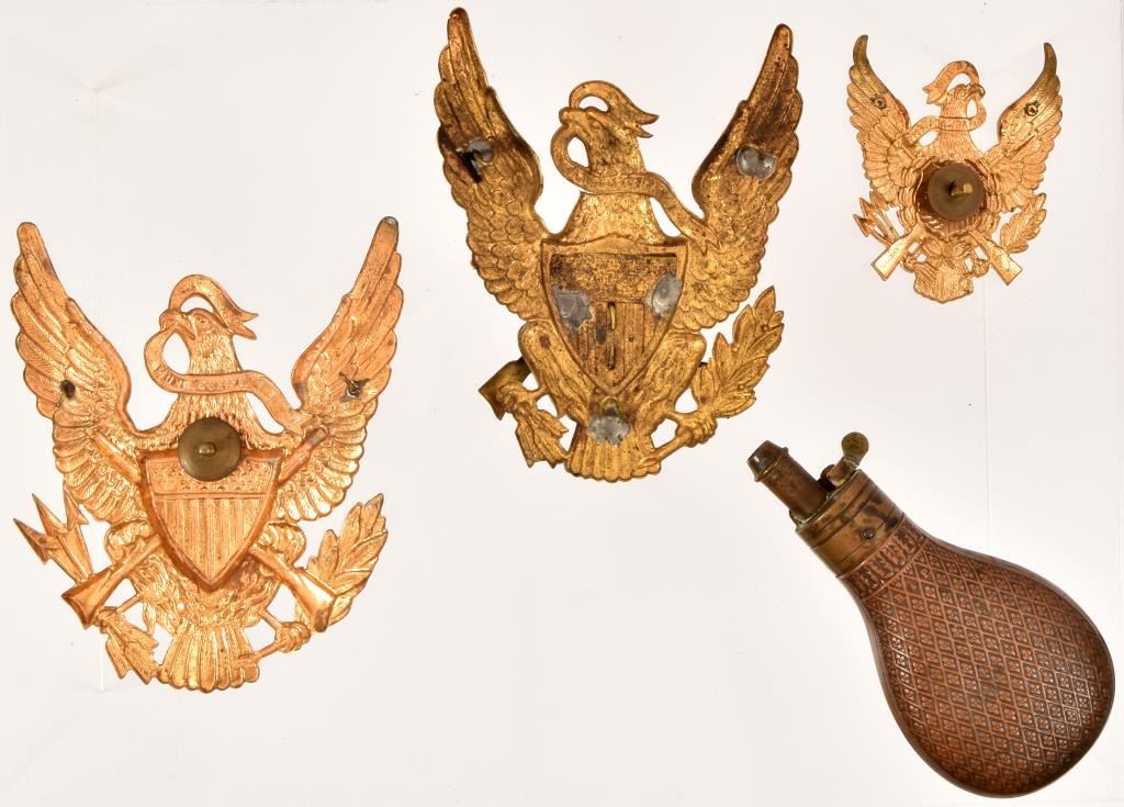 3 Great Shield emblems, one has "1" on front and a small powder flask.