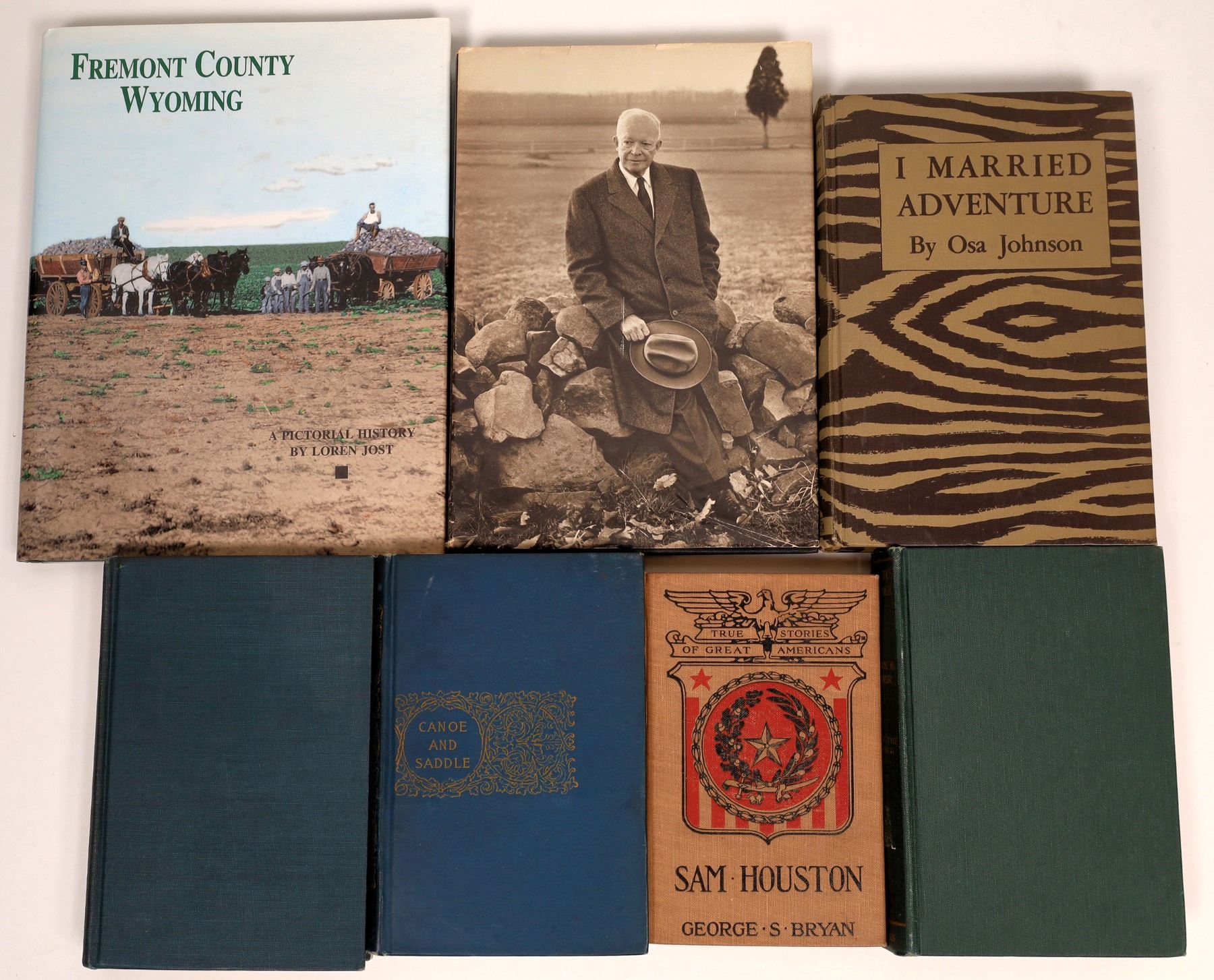7 volumes. Sam Houston by Brian; Canoe and Saddle by Winthrop; SantÈ Fes Partner by Javier; The West from a Car Window by Davis; I Married Adventure by Johnson; In Review by Eisenhauer; Freemont County Wyoming by Jost
