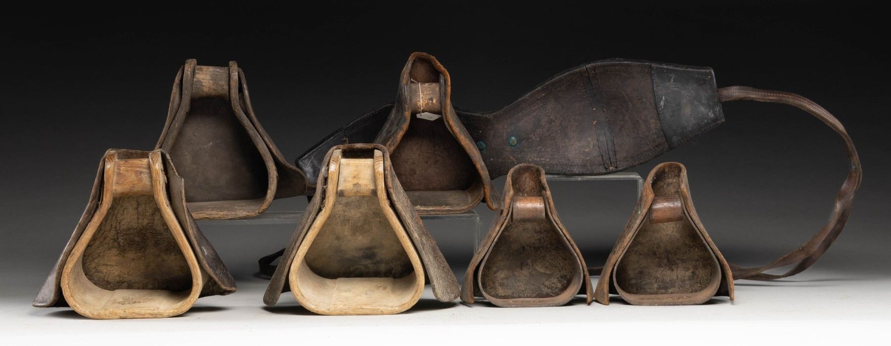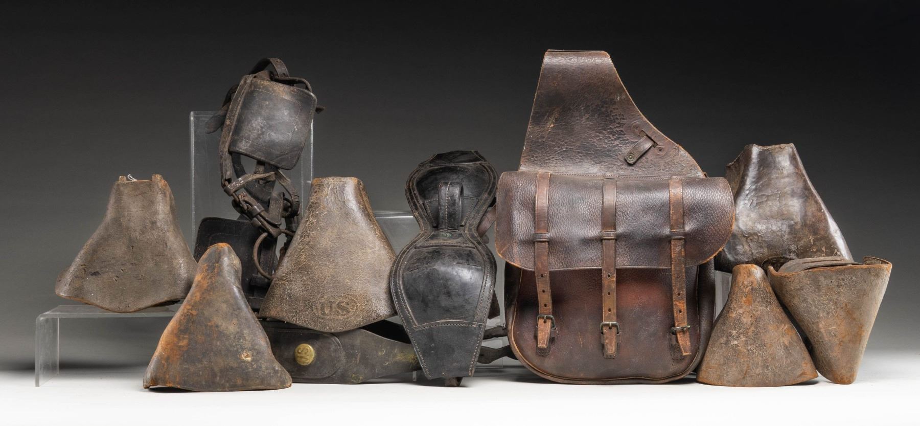 EQUIPMENT. This large group includes 1 set of US M1904 Cavalry saddle bags with all straps and buckles intact. / 3 Large wooden bodied, leather covered stirrups with embossed "US" in oval on the face. /1 Smaller wooden bodied, leather covered stirrup with a plain face. / 1 Pair of smaller iron bodied, leather covered stirrups with a plain face. / 1 Cavalry top harness. / 1 Cavalry top collar with for brass "US" bosses. / 1 Full set of Mule blinders with brass "US" bosses. CONDITION: stirrups show moderate to heavy wear but are complete. Saddlebags are very nice with minor wear. other pieces show light to moderate wear. (02-24197/BF). $400-600.