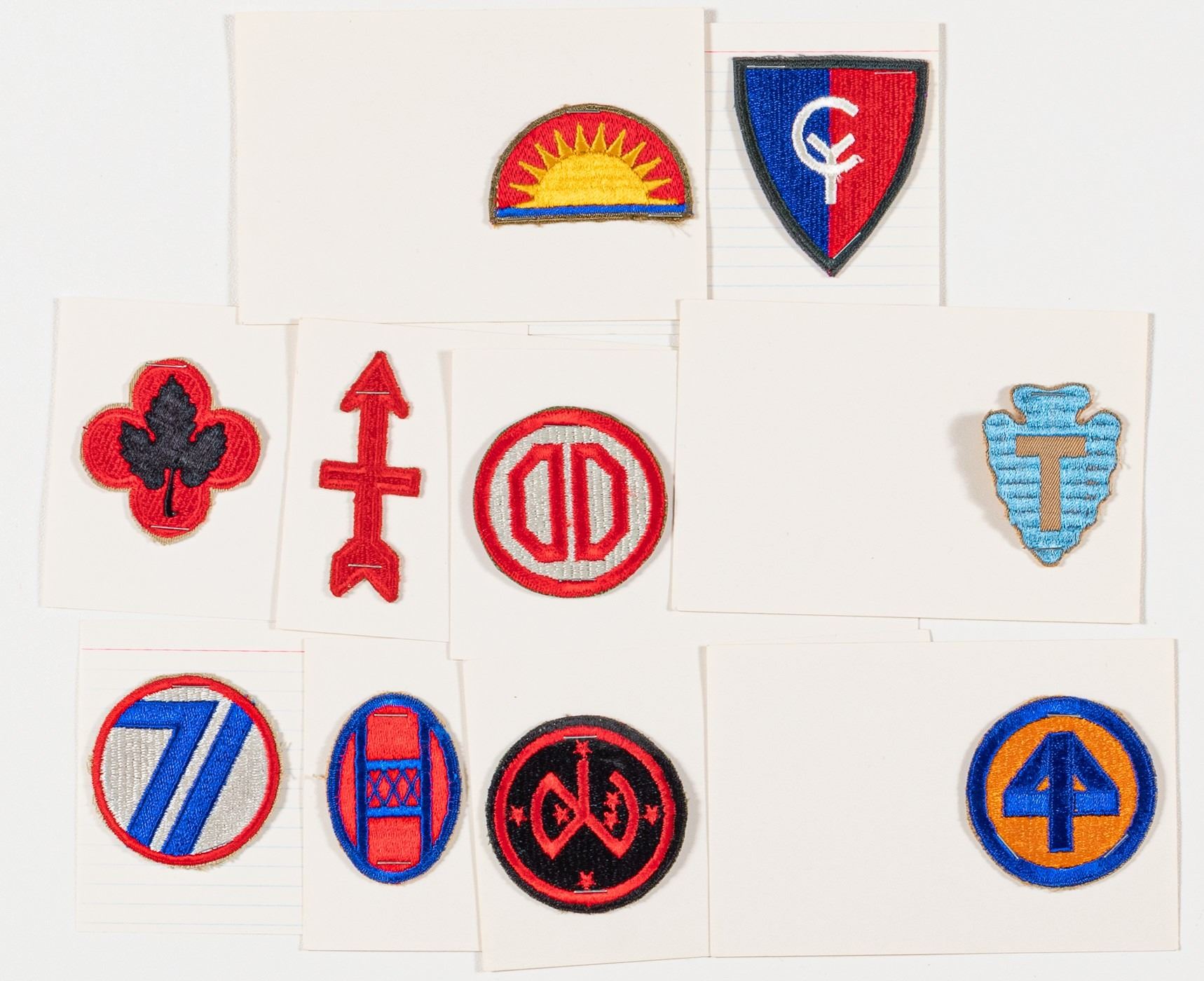 Lot of ten Infantry patches of 27th, 30th, 31st, 32nd, 36th, 38th, 41st, 43rd, 44th, and 71st Divisions. Stapled to index cards.