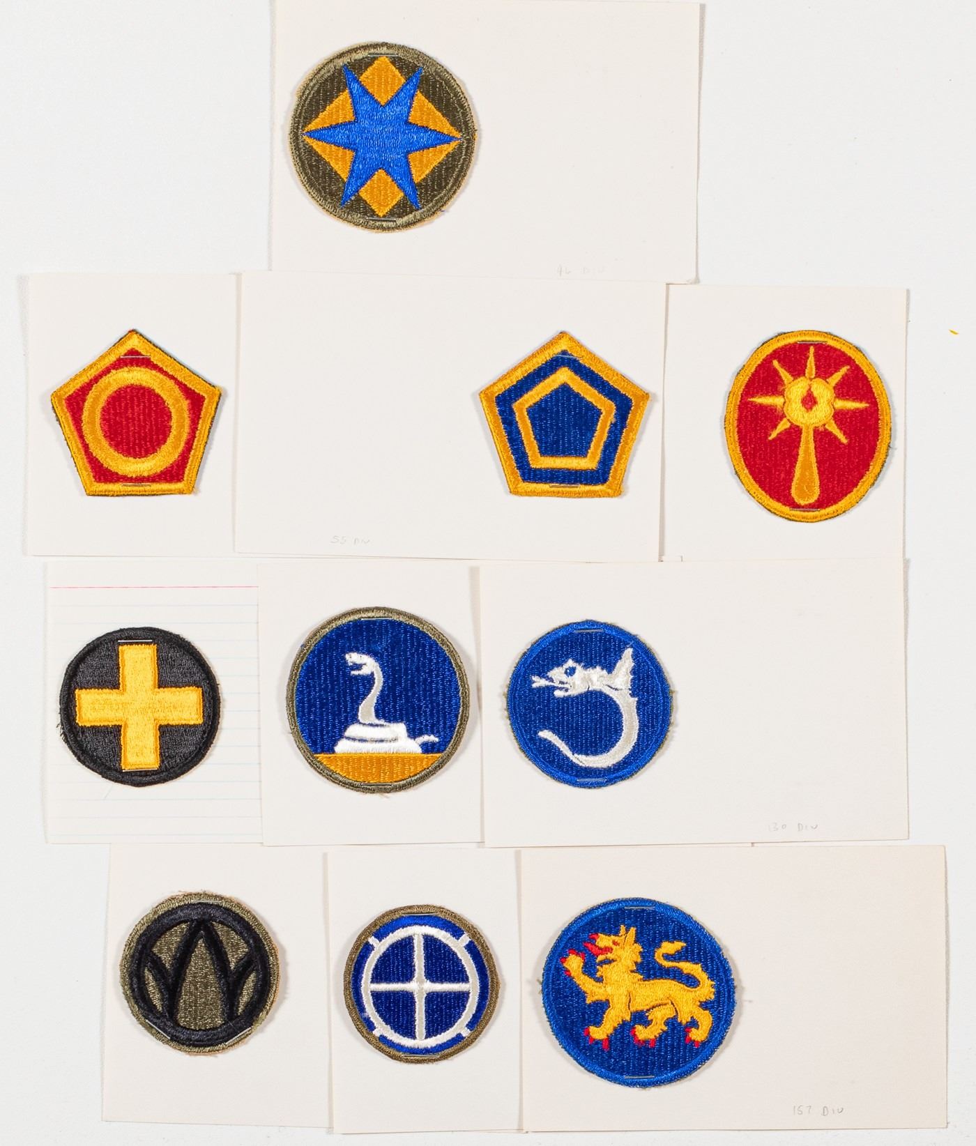 Lot of ten US Infantry shoulder patches of 33rd, 35th, 46th, 50th, 55th, 59th, 89th, 108th, 130th, and 157th Divisions. Stapled to index cards.