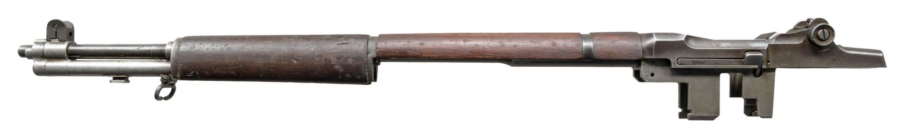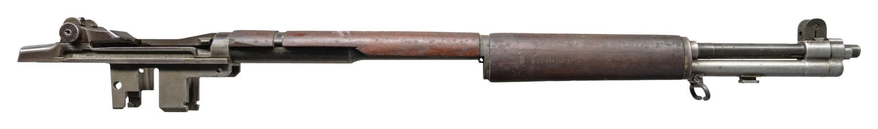BARREL AND PARTS. Cal. 30-06. S# 4547516. Bbl. 24". Throat gauges 4.0. Muzzle gauges 6.0. Barrel markings on right side include "LMR 6 53" & import marks. Receiver w/ standard markings at heel is marked "D6528291-F". Receiver is equipped w/ clip latch assembly T105E1 rear sight. Barrel carries walnut front & rear handguards w/ furniture. Gas cyl. w/ front sight & stacking swivel. High hump gas cyl. lock. Cross slot gas cyl. lock screw. CONDITION: handguards have extensive wear, staining, handling marks & full length cracks on top. Metal is well-worn, turning overall gray & patina w/ scattered spots of light oxidation. Bore has worn lands, turning dark in the grooves. (25-4404/RW). MODERN. $200-300.
