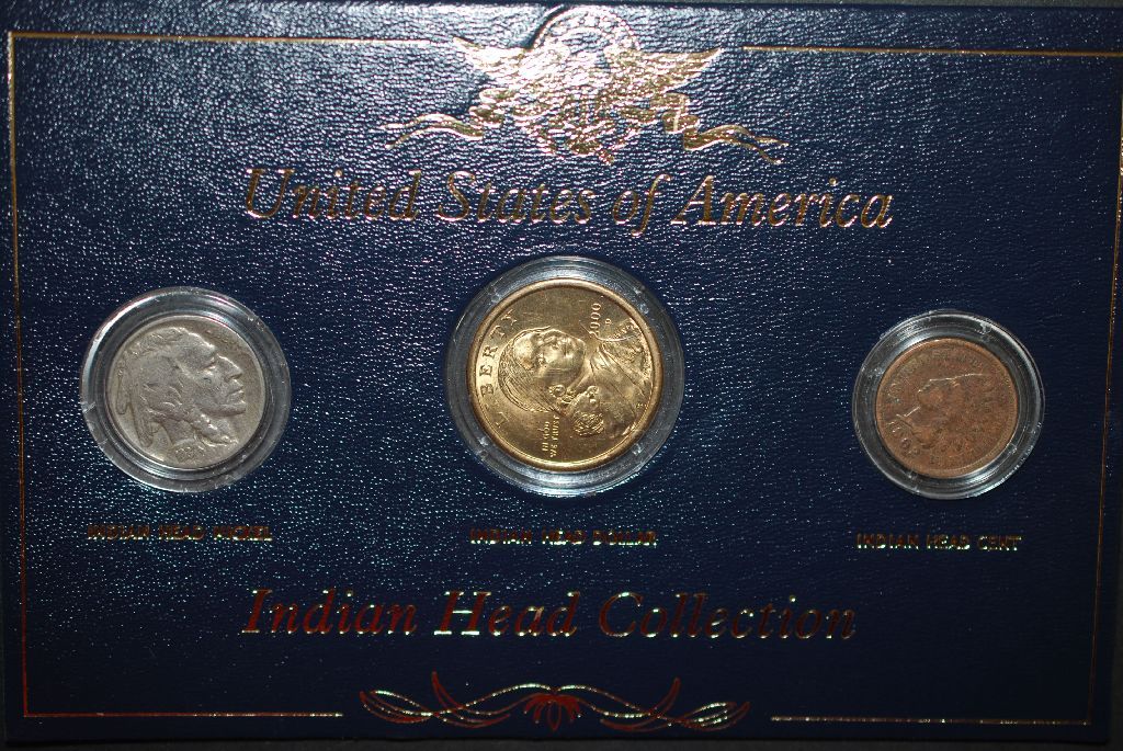 US Indian Head Coin Collection Set In Display Box; 1937 Buffalo Nickel, 2000-D Sacagawea $1 & 1902 Indian Head One Cent; Lot of 3 Coins; EST. $5-10